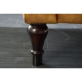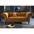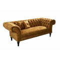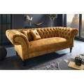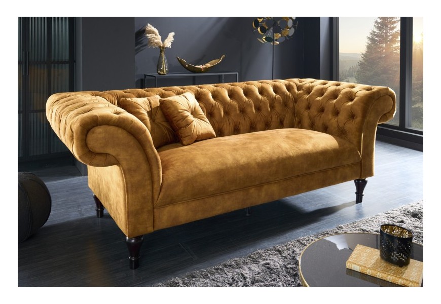 Chesterfield sedačka Contessa so zamatovým čalúnením v horčicovo žltej farbe s vyrezávanými drevenými nožičkami 225cm