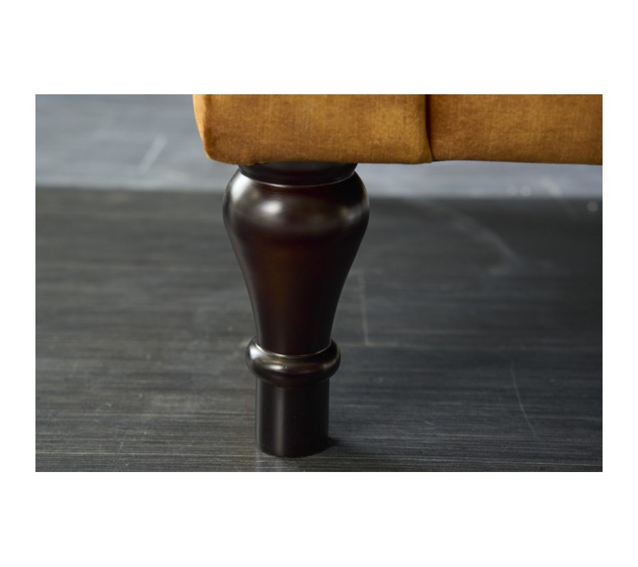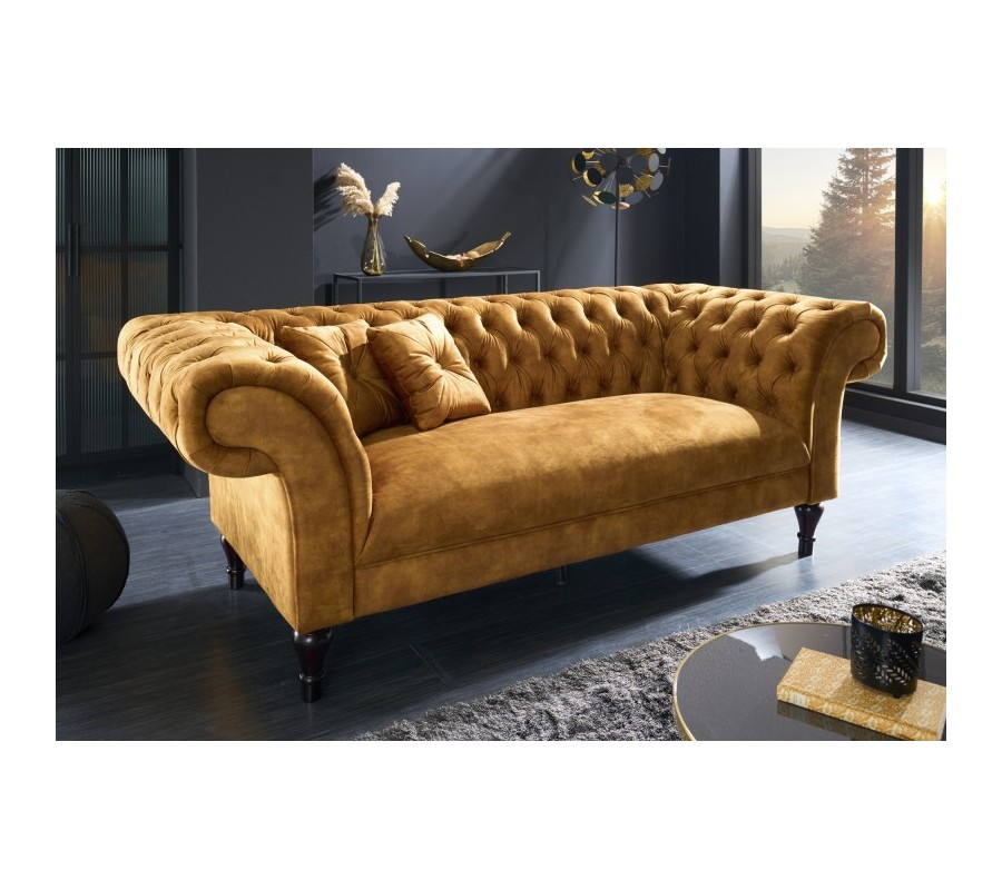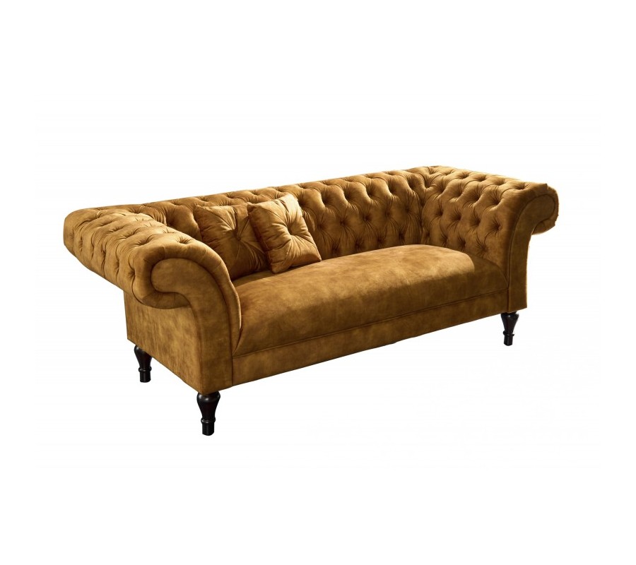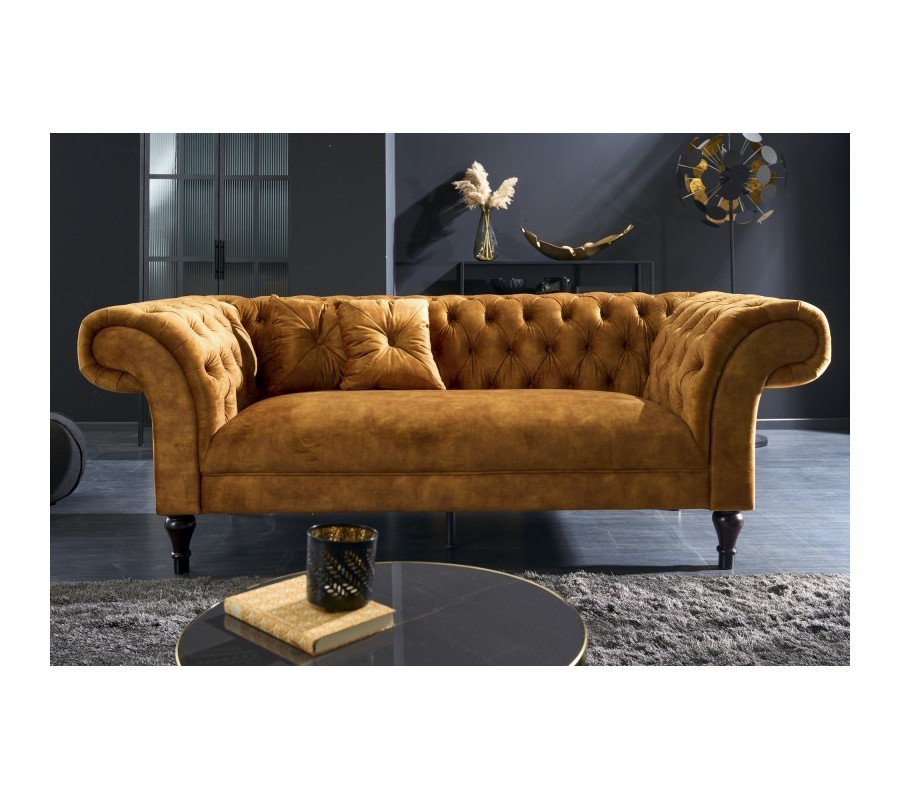 Elegantná sedačka Contessa je nadčasovým kúskom, ktorý zaujme svojím moderným prevedením v žiarivej okrovej farbe. Príjemné zamatové čalúnenie je na chrbtovej časti a podrúčkach doplnené štýlovým chesterfield prešívaním, ktoré vytvára luxusný nádych. Elegantný vzhľad dopĺňajú tmavohnedé vyrezávané masívne nožičky. Sedačka Contessa okrem pohodlných opierok a sedacej časti disponuje tiež dvomi praktickými vankúšikmi v rovnakej farbe. Vďaka žiarivému odtieňu je skvelým adeptom na doladenie tmavšie zariadených moderných obývačiek s tmavohnedým alebo čiernym masívnym nábytkom, kde bude pôsobiť luxusným dojmom. V svetlejších miestnostiach zasa vytvorí hravý moderný efekt. Sedačka Contessa krásne vynikne v kombinácii so skleneným či kovovým konferenčným stolíkom a prvkami so zrkadlovým efektom.