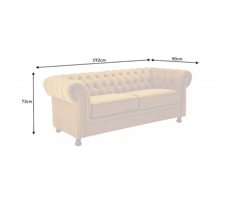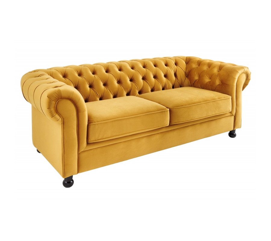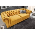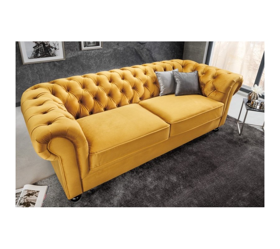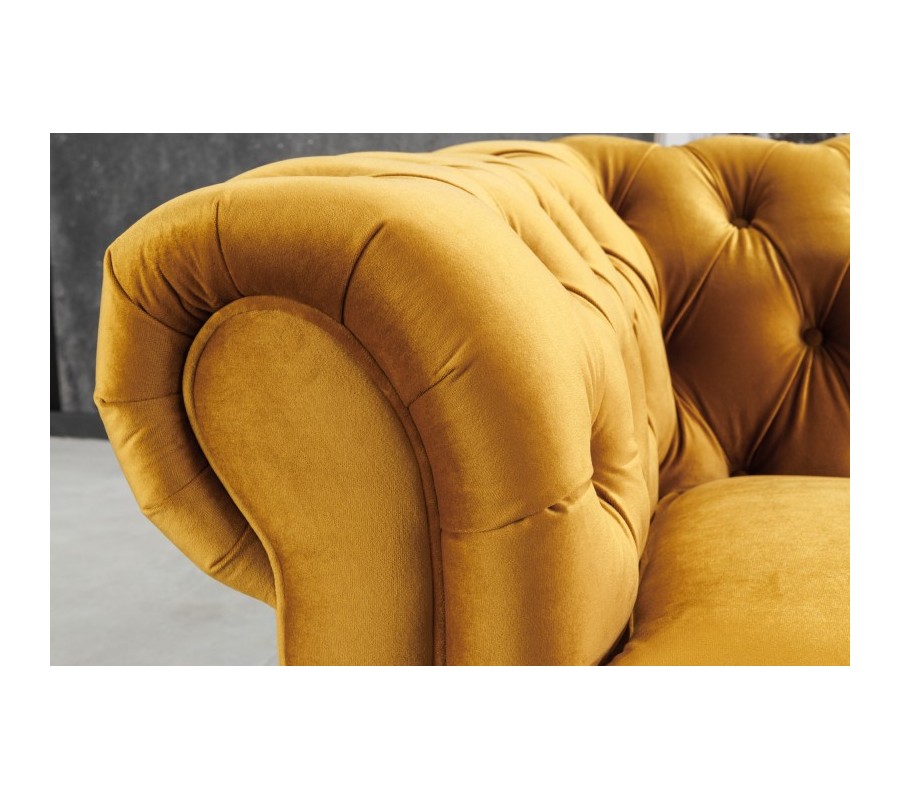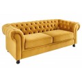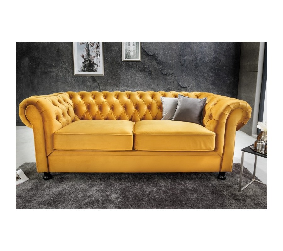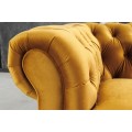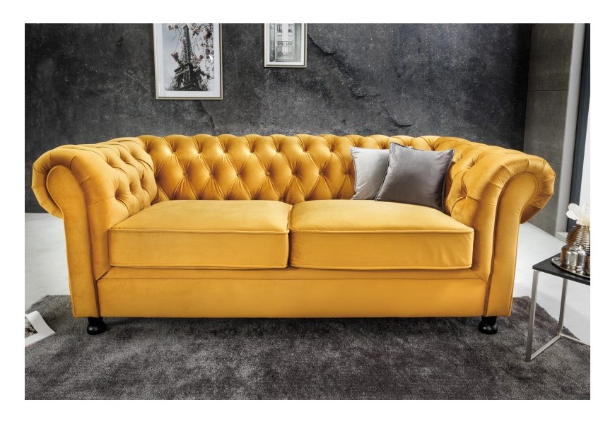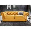 Chesterfield dizajnová trojsedačka Milenna so horčicovožltým zamatovým poťahom a s čiernymi nožičkami 192cm