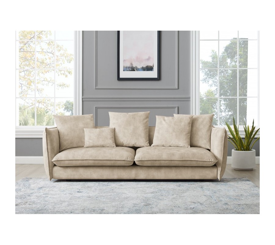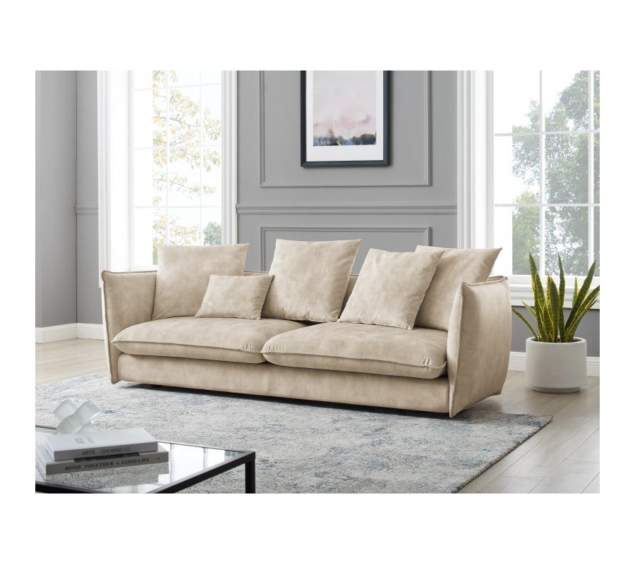 Sedačka Simeon je moderným kúskom, ktorý prináša súlad elegancie a pohodlia do vašej obývačky. Sedačka disponuje príjemným zamatovým poťahom v svetlobéžovej farbe v odtieni šampanského, ktorým príjemne doladí váš interiér. Univerzálna svetlá farba zaručuje jednoduchú kombinovateľnosť aj s ďalšími prvkami a nábytkom vo vašom interiéri, zatiaľčo tiež pôsobí elegantným a moderným dojmom. PJmný zamat sa postará o vaše pohodlie, ku ktorému dopomôžu tiež praktické vankúšiky spríjemňujúce vaše sedenie. Elegantný vzhľad sedačky Simeon možno vhodne doplniť nábytkom z dreva i z kovu, rovnako ako aj rôznymi textíliami v svetlejších prírodných odtieňoch zelenej, bledohnedej či modrej. Sedačka je vhodná na pohodlné usadenie pre 4-5 ľudí.
