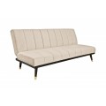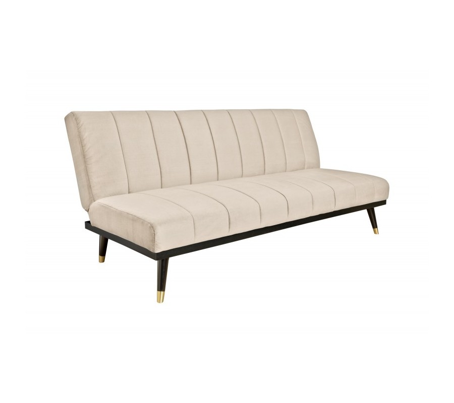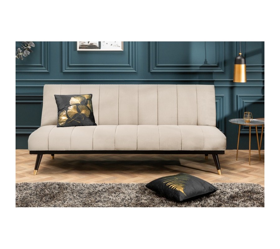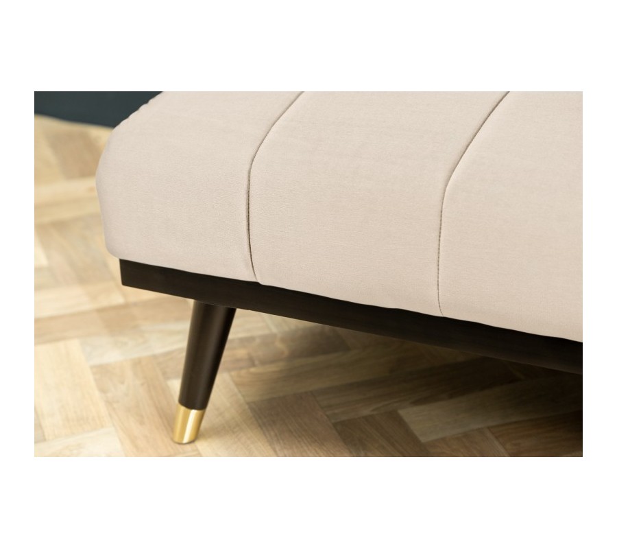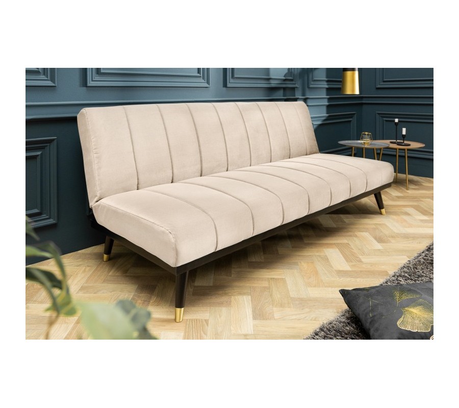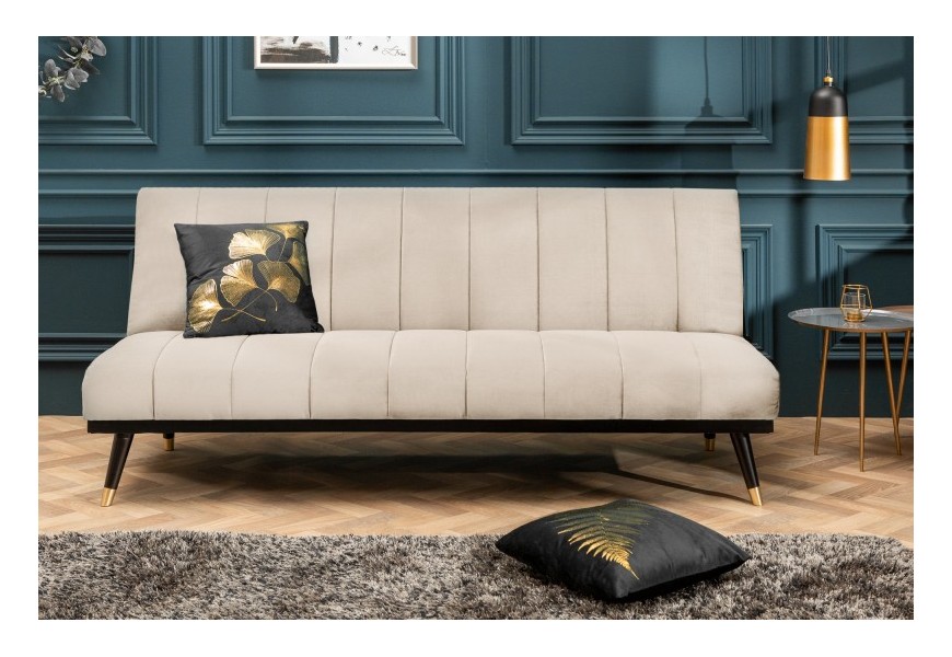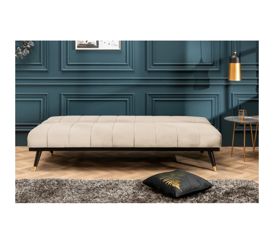 Dizajn pohovky Taxil je inšpirovaný dnes veľmi populárnym retro štýlom. Jednoduchý tvar sedacej časti bez opierok vytvára nadčasový a štýlový kúsok, ktorý vkusne doplní priestory vašich obývačiek či hosťovských izieb. Vďaka jemnému nádychu štýlu art deco v podobe elegantných čiernych nožičiek so zlatými prvkami je tiež vhodným doplnkom do luxusnejšie glamour ladených pracovných priestorov. Príjemné čalúnenie v svetlej béžovej farbe v odtieni champagne je doplnené vertikálnym prešívaním vytvárajúcim elegantný vzhľad. Jednoduchý systém umožňuje sedačku sklopiť a vytvoriť tak komfortnú plochu na spánok. Sedačka je tak ideálnym riešením pre všetkých, ktorí radi privítajú návštevu, no nemajú samostatnú hosťovskú izbu. Rozmer sedačky Taxil je dostatočný pre pohodlné usadenie štyroch osôb. Pohovku Taxil môžete kombinovať s retro ladenými kúskami, no vhodné je tiež doplnenie kovových zlatých prvkov v štýle art deco.