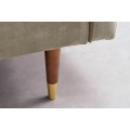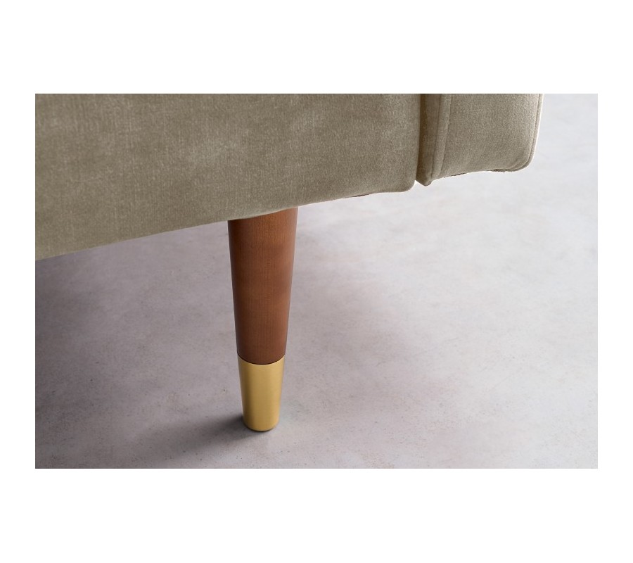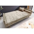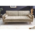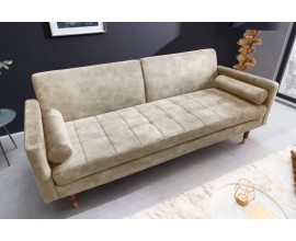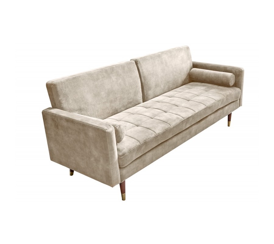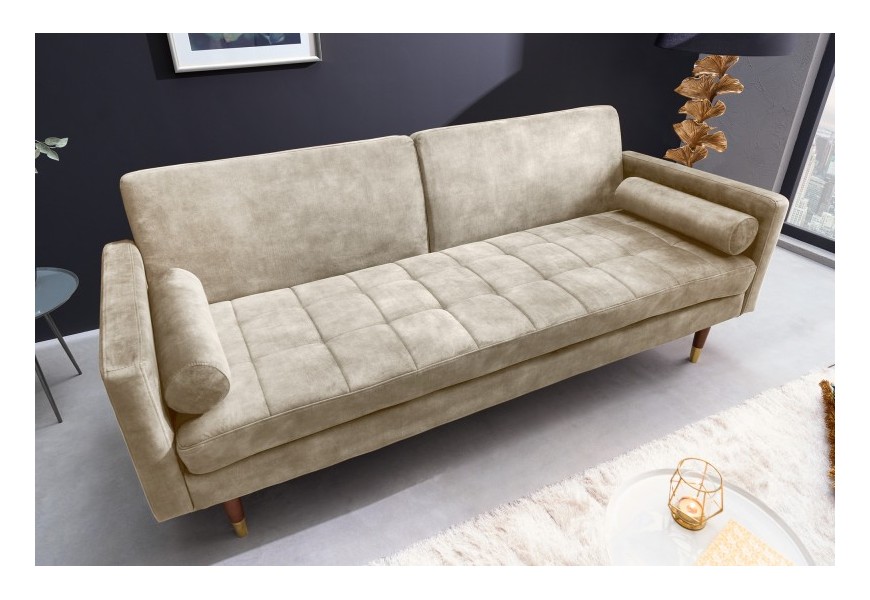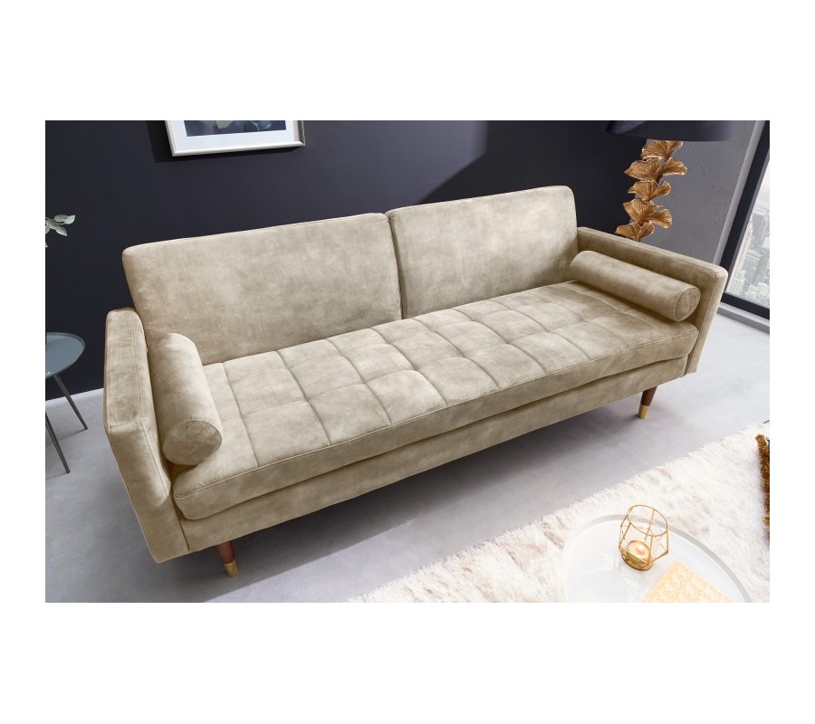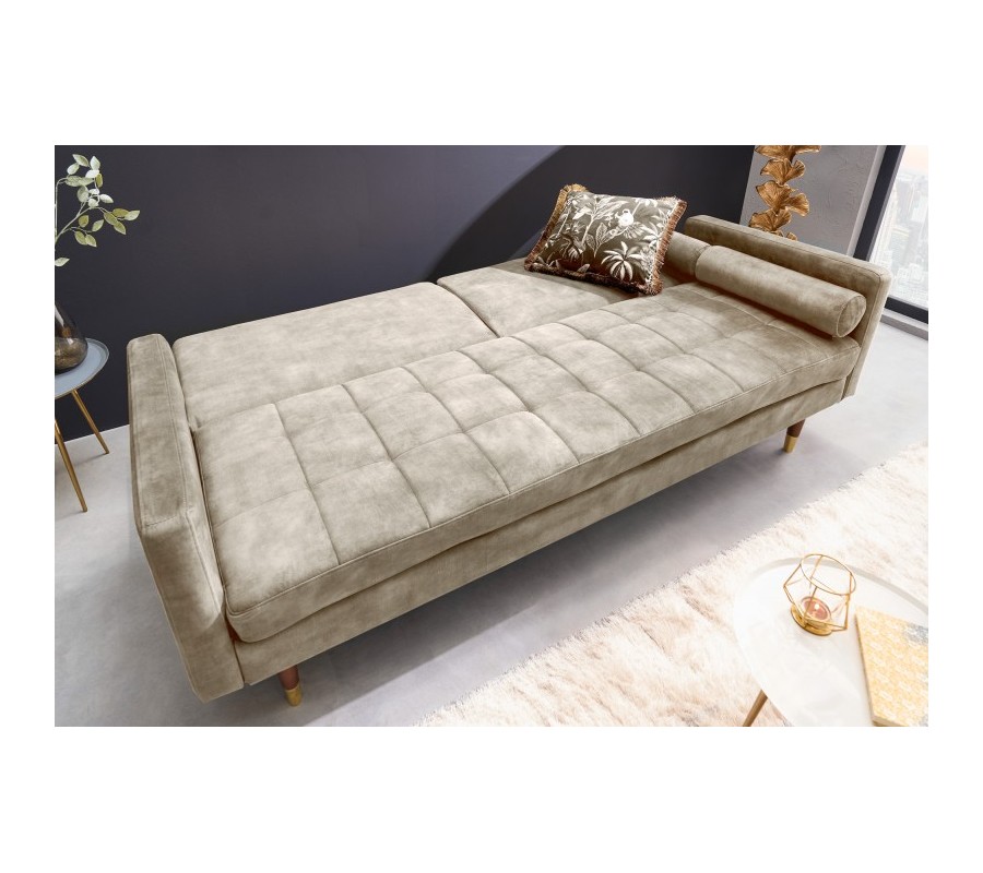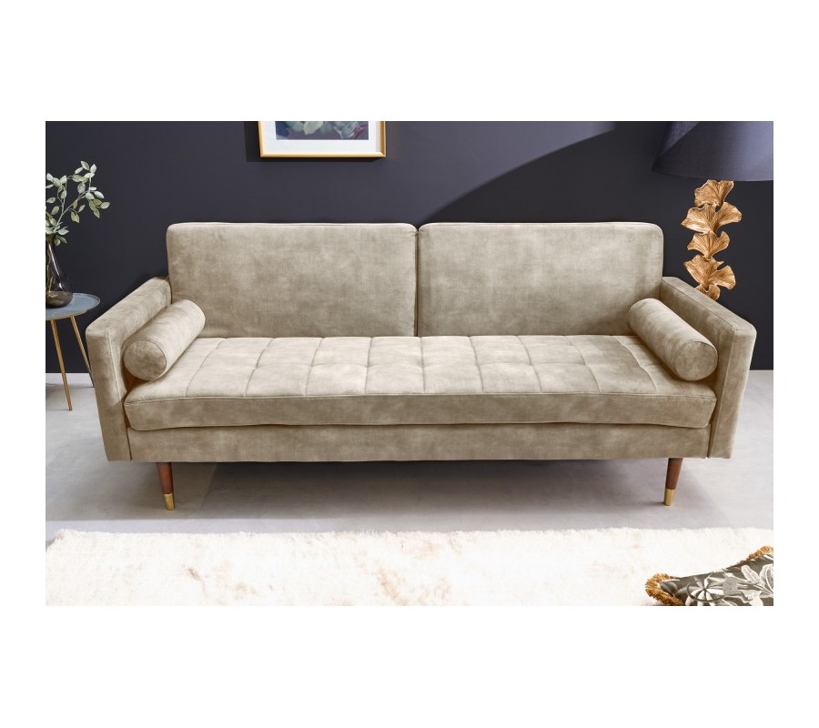 Dizajnová sedačka Nefertiti je stelesnením elegancie s nádychom art deco štýlu. Sedačka disponuje príjemným čalúnením nesúcim sa v svetlej béžovej farbe v odtieni champagne, čo vytvára luxusný nádych a zároveň je tak sedačka univerzálna a ľahko kombinovateľná. Čalúnenie na sedacej časti dotvára štýlové lineárne prešívanie a dva praktické vankúšiky po bokoch. Jednoduchý mechanizmus umožňuje rozloženie sedačky na rovnú plochu, ktorá zaručí dokonale komfortný a príjemný spánok všetkým vašim návštevníkom. Sedačka tak skvelo doplní nielen obývačky, ale aj hosťovské izby či dizajnové pracovné priestory. Celkový elegantný vzhľad dopĺňajú hnedé drevené nožičky so zlatými ozdobnými prvkami. Sedačka Nefertiti skvelo doplní art deco a glamour ladené priestory v kombinácii s kovovým či skleneným konferenčným stolíkom a dizajnovými doplnkami v zlatej farbe.