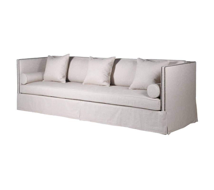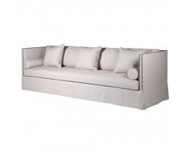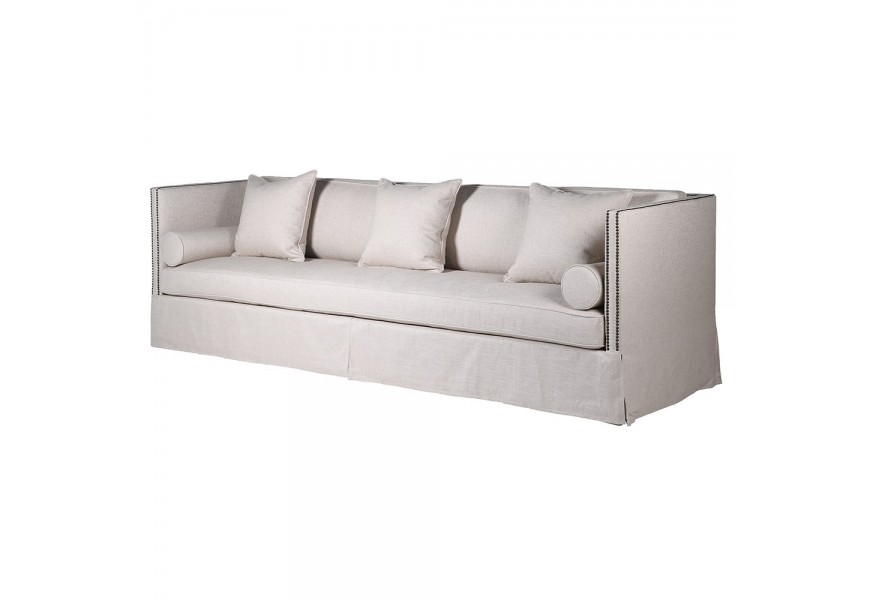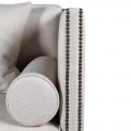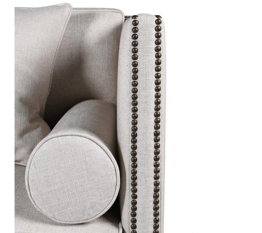 Čalúnenie sedačky disponuje kvalitným vyhotovením z príjemnej kombinácie textilu, bavlny a ľanu v svetlosivej taupe farbe. Taupe sivá farba zaručí ľahkú kombinovateľnosť s nábytkom v modernom štýle, pričom dva rady čiernych dizajnových cvokov na bočných opierkach prinesú štvorsedačke príjemný kontrastný prvok s jemným klasickým nádychom.