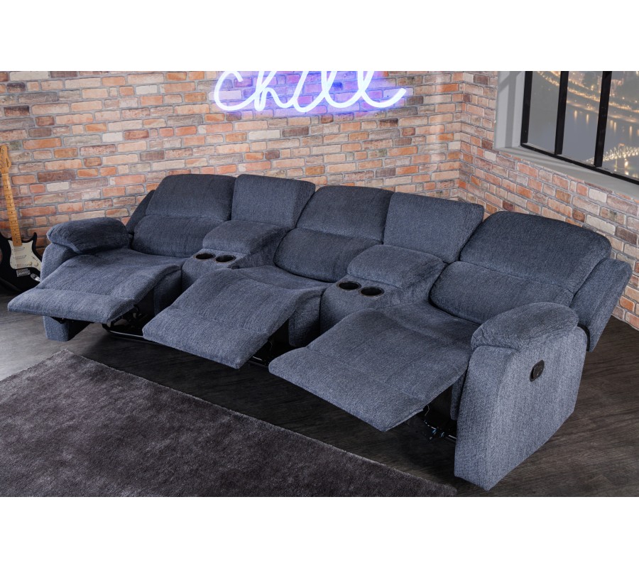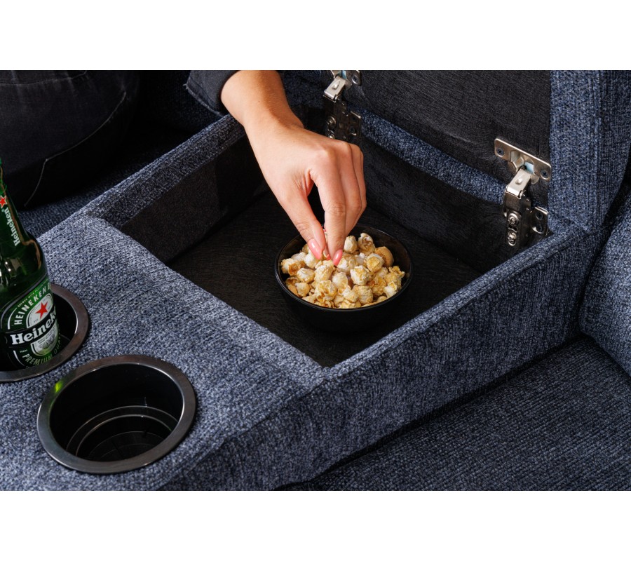 Filmové večery si vďaka domácej kinosedačke Phoenix môžete užiť doma v maximálnom komforte. Sedačke dominujú dve široké opierky, každá obsahuje dva držiaky na poháre a uzatvárateľný úložný priestor. Na bočnej strane je umiestnená páčka, ktorou môžete sklápať a zdvíhať sedadlá. K pohodlnému sedeniu pre tri osoby prispeje aj poťah zo sivej štruktúrovanej látky, ktorá je odolná a zároveň príjemná na dotyk. Každé sedadlo má plochu na sedenie 55x53 cm a nosnosť 120 kg. Ak plánujete sedačku umiestniť do domácej kino miestnosti, môžete ju doplniť tmavými stenami a kobercom pre autentický pocit kinosály priamo vo vašom domove. Sedačka si však nájde miesto aj vo vašej obývačke. Ak chcete, aby miestnosť pôsobila neutrálnym pokojným dojmom, kde vás nič nebude rušiť, môžete použiť moderný nábytok v odtieňoch šedej, bielej, alebo čiernej. Hodí sa však aj do industriálnych priestorov, s ktorými môžete sedačku prepojiť vďaka jej farbe poťahu.