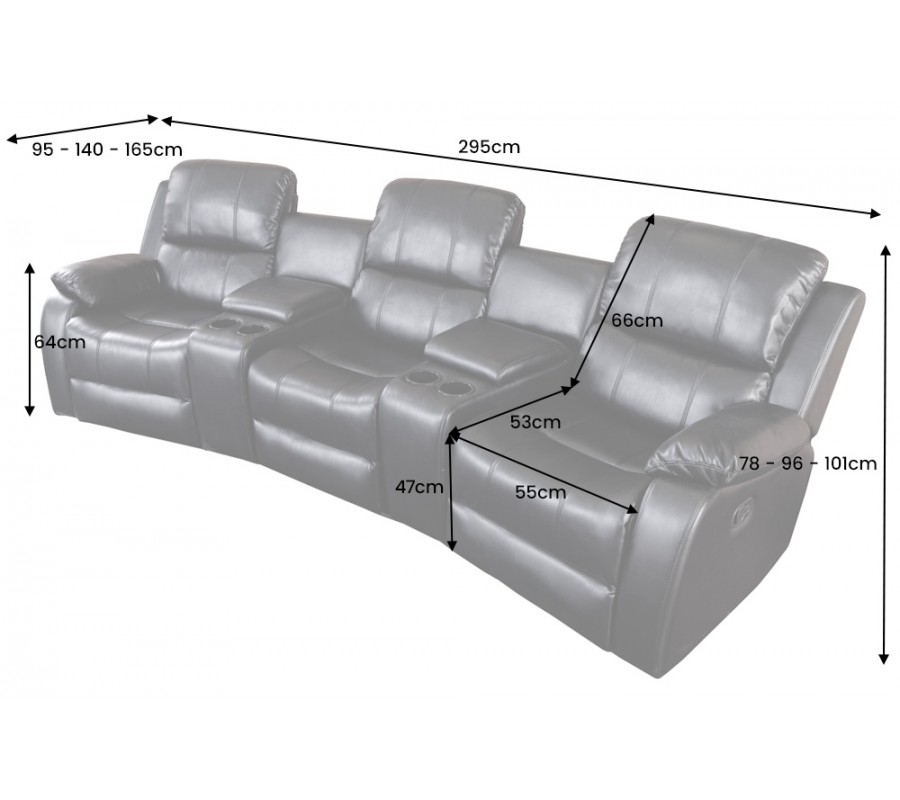 Luxusná moderná kinosedačka Phoenix s držiakom na poháre a úložným priestorom, polohovateľná trojmiestna, sivá 295 cm