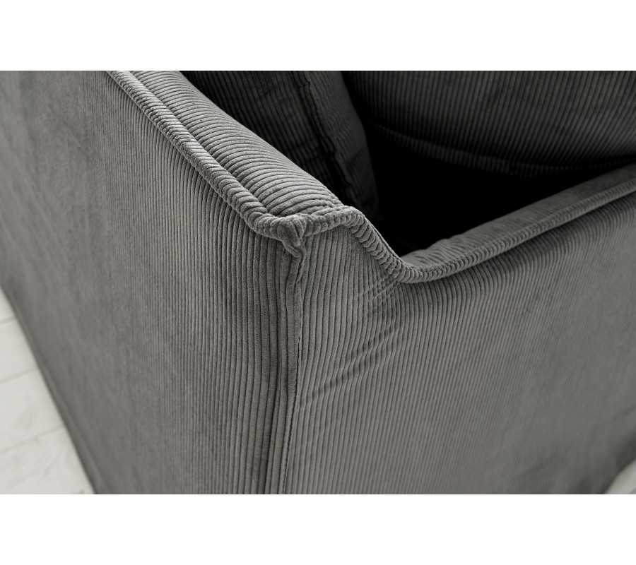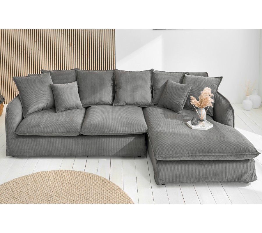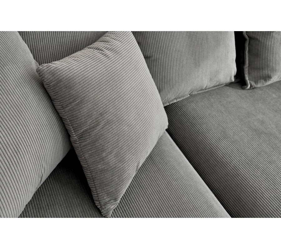 Rohová sedačka Heaven si vás získa svojím poťahom z príjemnej menčestrovej látky. Pruhovaná štruktúra látky sa prepája s jednoduchými lineárnymi tvarmi sedačky typickými pre moderný nábytok. V kombináciou s elegantnou a distingvovanou sivou farbou vzniká dizajn, ktorý ľahko zakomponujete do interiérov v neutrálnych farbách alebo tiež s výraznejšími farebnými doplnkami. Hrany sedačky sú zaoblené prešívaním poťahu, čím sedačka získava masívny a útulný vzhľad. Pohodlné sedenie pre štyri osoby zaručí šesť veľkých a dva menšie vankúše. Sedačka má rám z masívneho dreva, penové čalúnenie a odpružené jadro. Ak chcete, aby vynikol menčestrový poťah, môžete sedačku doplniť moderným nábytkom s hladkými povrchmi, napríklad stolíkom s kovovými nožičkami a sklenenou doskou. Neutrálnu sivú farbu môžete tiež skombinovať s konferenčným stolíkom zo svetlejšieho masívneho dreva. Vytvoríte tak príjemný kontrast prírodného materiálu a štruktúry čalúnenia a dosiahnete tak nadčasový vzhľad. Rohovú časť je možné umiestniť len na pravú stranu.
