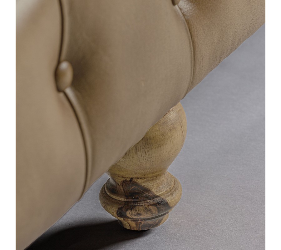 Silueta sedačky verne sleduje klasické charakteristiky chesterfield štýlu. Na prvý pohľad vás upúta hlboké dekoratívne prešívanie s okrúhlymi gombíkmi v spodnej časti a na opierke, ktorá má klasický tvar so zahnutou vrchnou časťou. Pohodlné sedenie pre 4 osoby zaručia dva sedacie vankúše. Predná strana opierok je tiež ozdobená okrúhlymi kovovými nitmi. Sedačka je postavená na šiestich okrúhlych vyrezávaných nožičkách z dreva v prírodnej hnedej farbe s viditeľnou kresbou letokruhov.