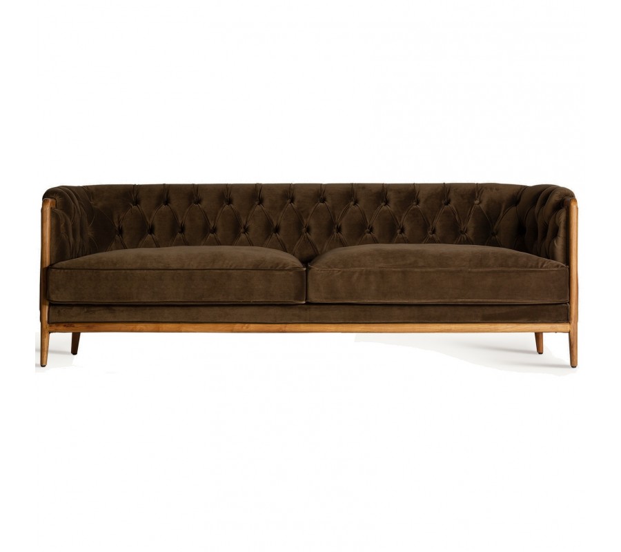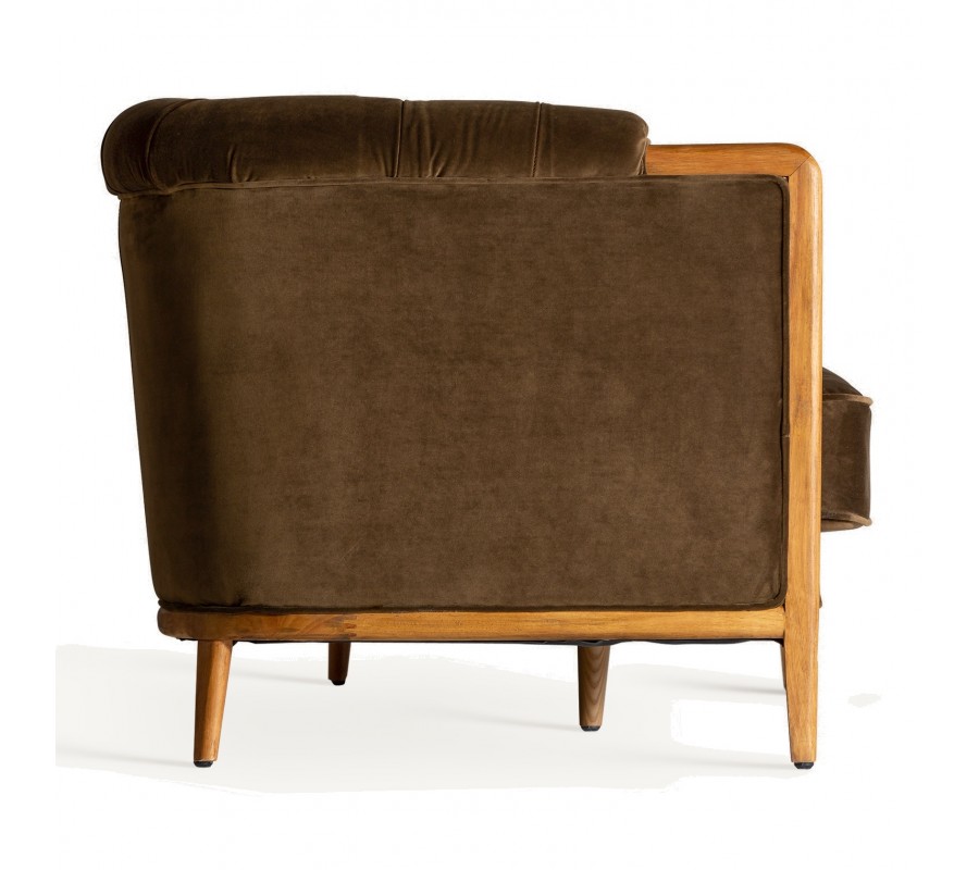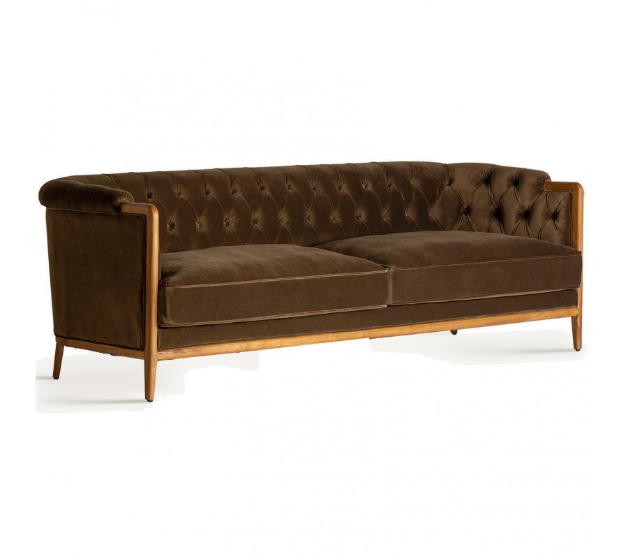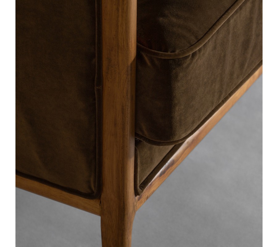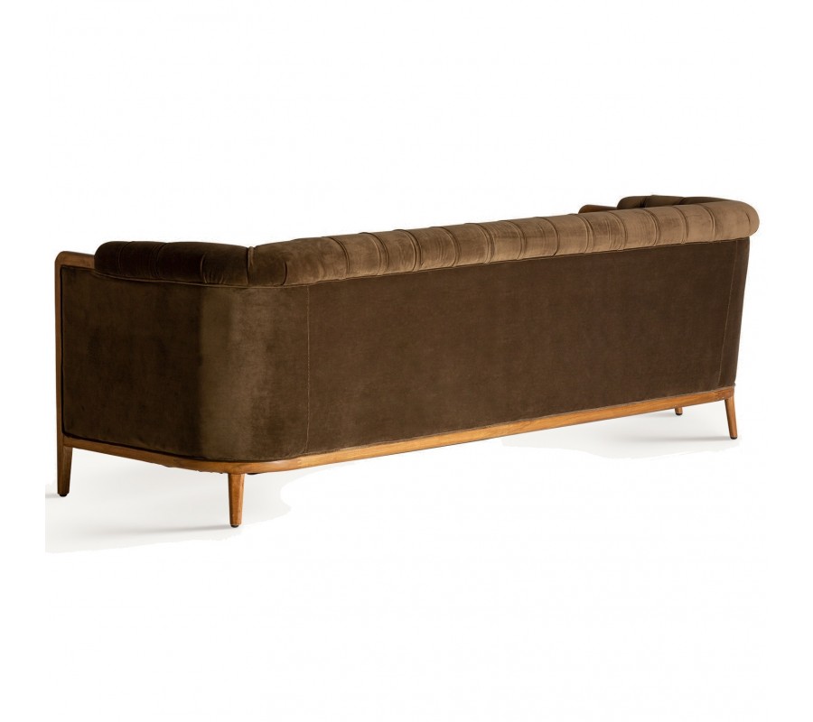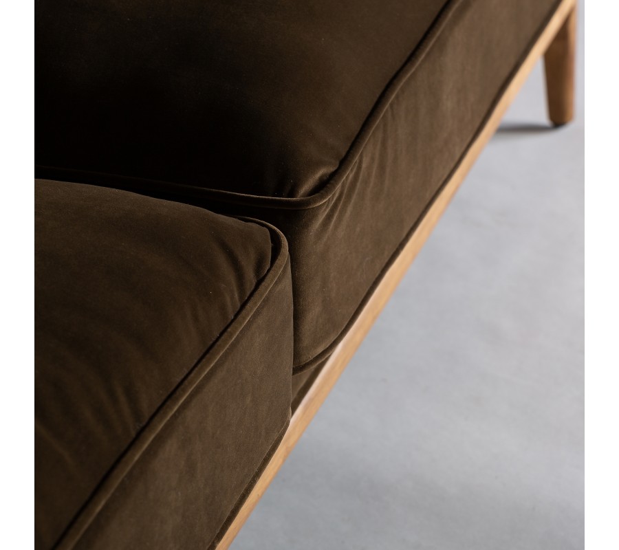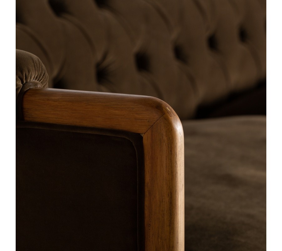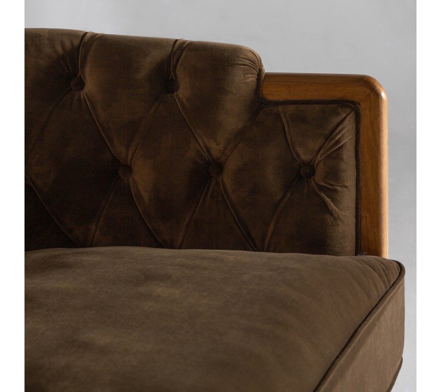 Sedaciu časť tvoria dva pohodlné vankúše. Sedačka je potiahnutá látkou aj na zadnej a bočných stranách. Vnútorná časť opierky je zdobená luxusný prešívaním v štýle chesterfield s hlbokými okrúhlymi gombíkmi. Vrchná časť opierky je zahnutá smerom von, čo je ďalším typickým znakom chesterfield nábytku. Tieto ikonické znaky dodávajú sedačke nádych luxusu. Poťahová látka má hnedú farbu s olivovými podtónmi a so zamatovým finišom je veľmi príjemná na dotyk.