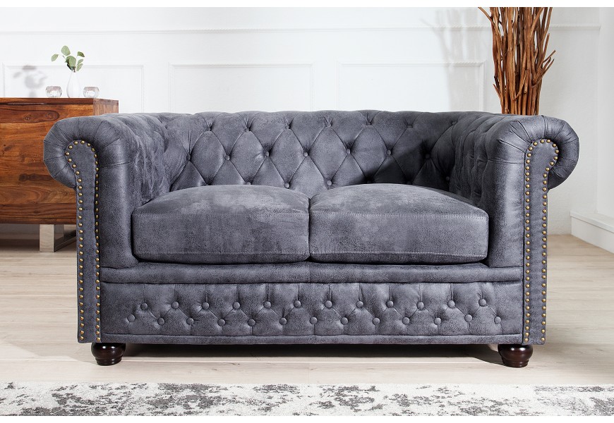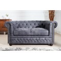 Dizajnová vintage dvojsedačka Chesterfield Grau so sivým poťahom so zahnutými opierkami a chesterfield prešívaním 150 cm