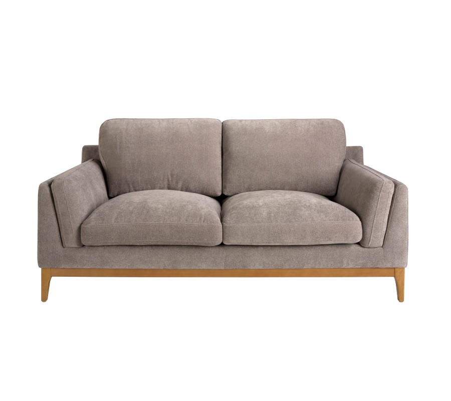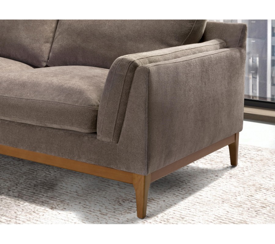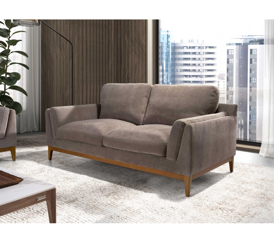 Luxusná moderná čalúnená dvojsedačka Vita Naturale s retro nádychom s drevenými nožičkami a textilným poťahom hnedo sivá 195 cm