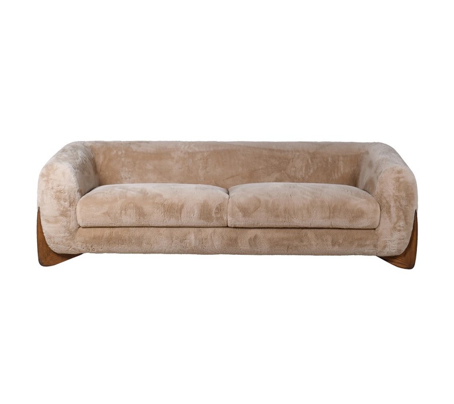 Luxusná dizajnová trojsedačka Fluffy s kožušinovým poťahom v svetlej hnedej farbe a dubovými nohami 225 cm