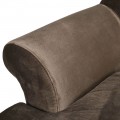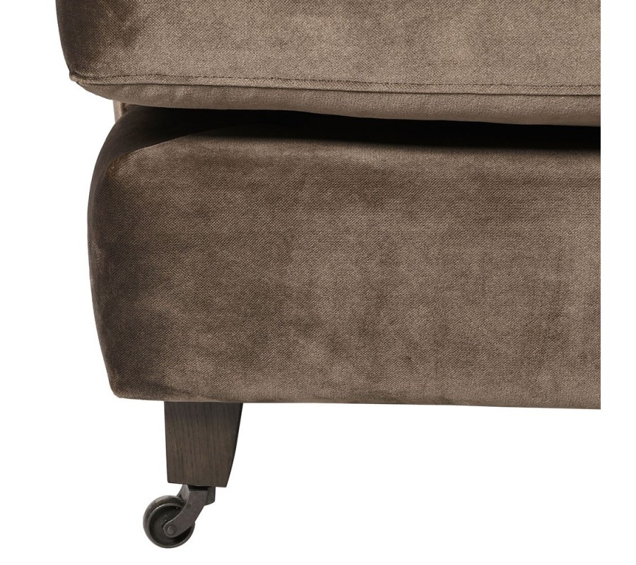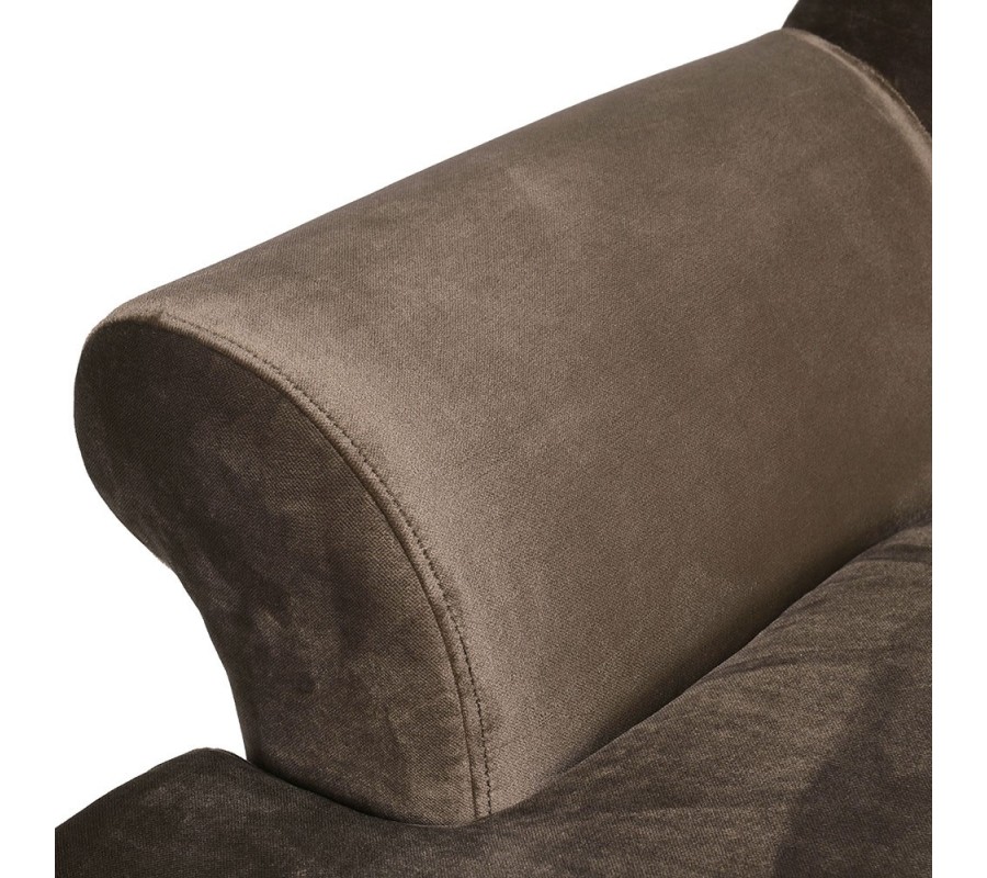 Čalúnenie je v príjemnom zamatovom materiáli v tlmenej hnedej farbe, ktorý jej dáva luxusný a hrejivý charakter. Stojí na štvorici diskrétnych nožičiek s kolieskami, ktoré uľahčujú manipuláciu a pridávajú praktickosť. Prvok zároveň prispieva k celkovému vintage šarmu nábytku.