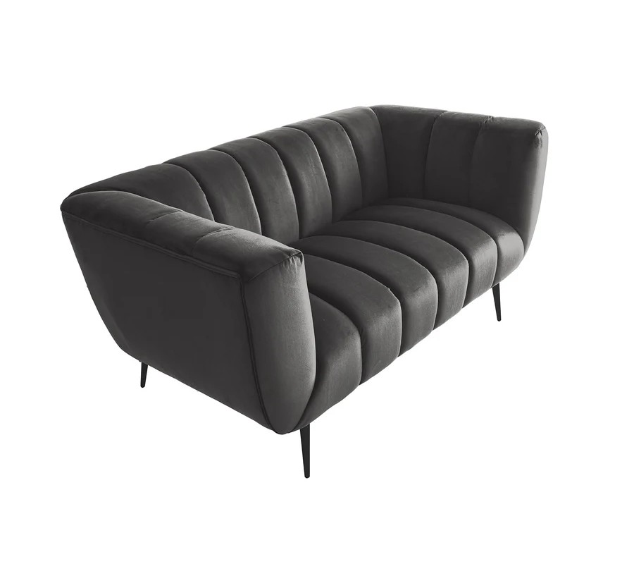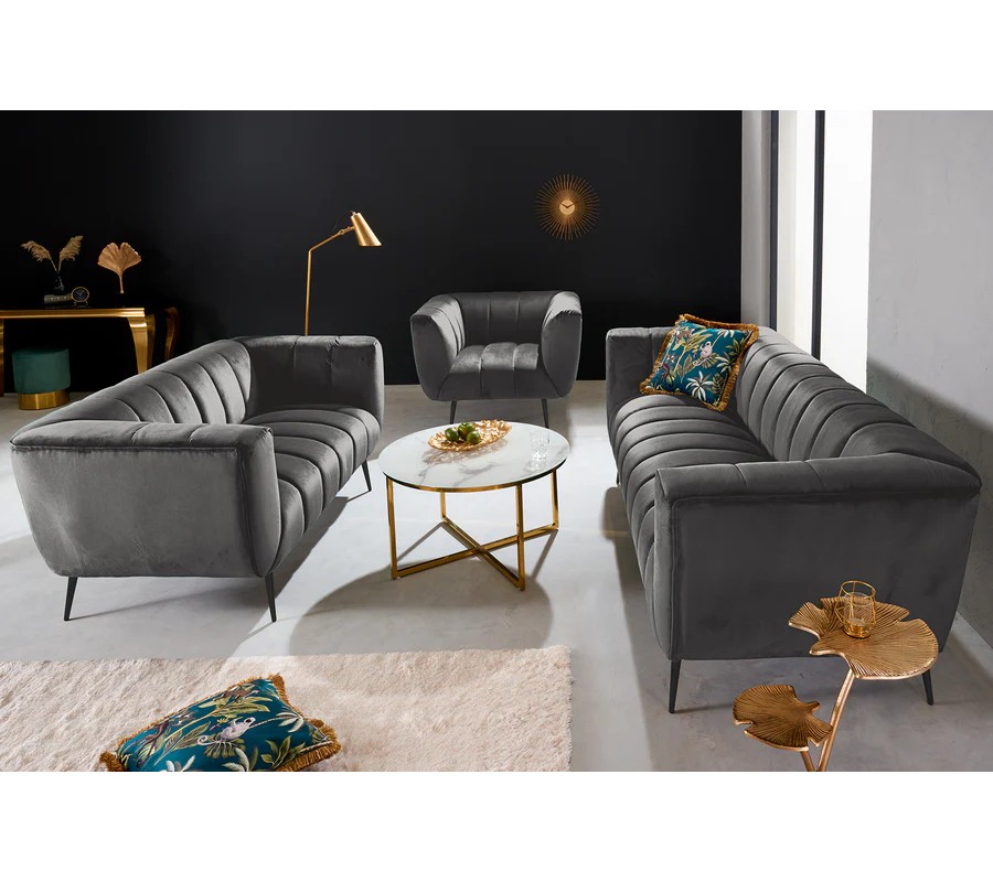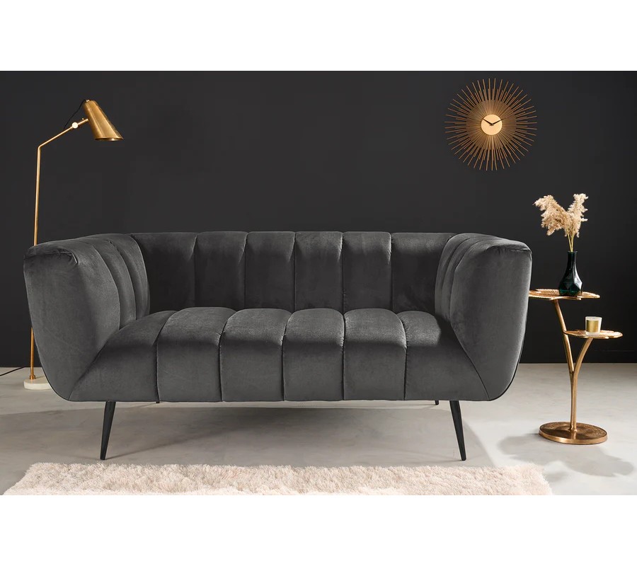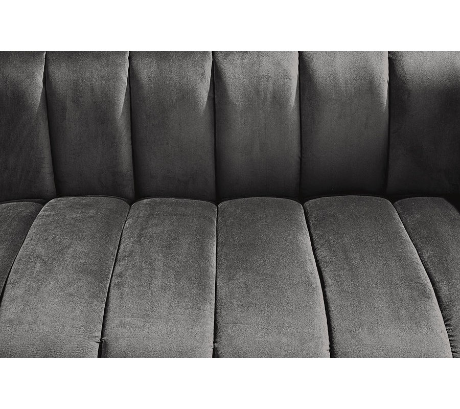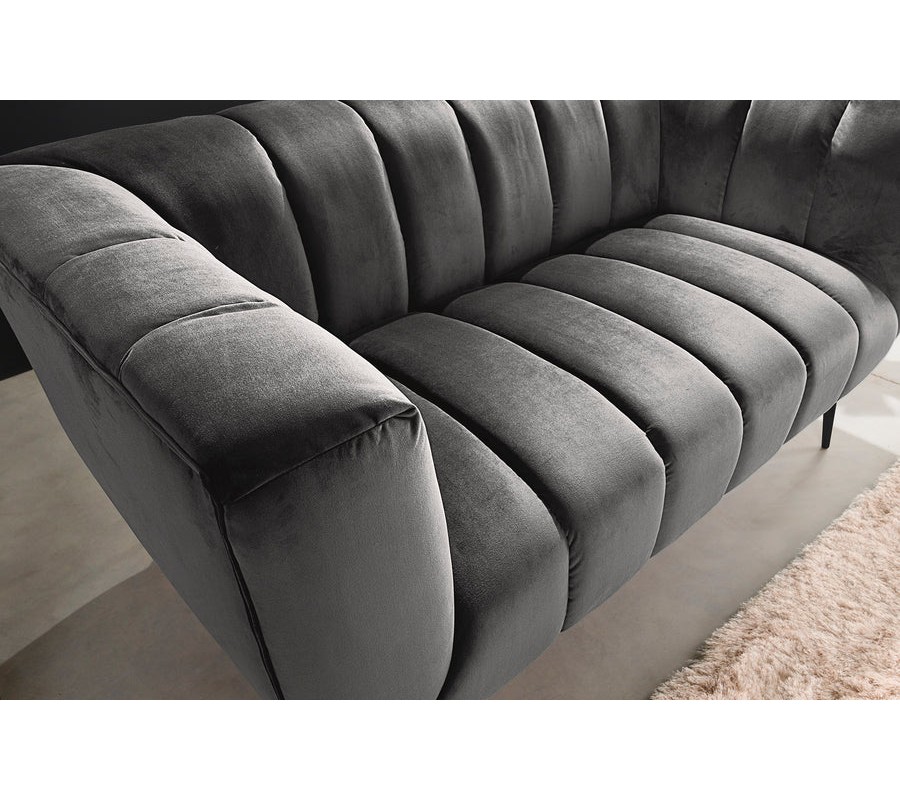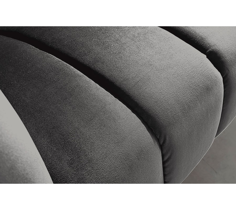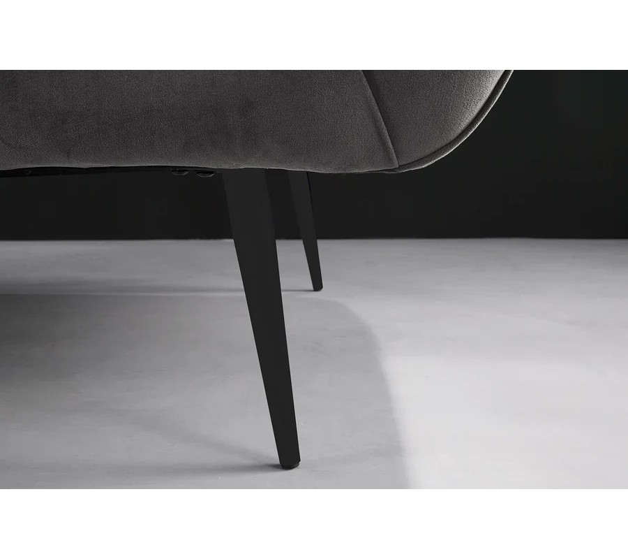 Materiál použitý na čalúnenie je kvalitná zamatová látka, ktorá pôsobí luxusne a príjemne na dotyk. Farebné prevedenie v tmavosivej farbe dodáva pohovke sofistikovaný a moderný vzhľad. Povrch zamatovej látky má jemnú štruktúru, ktorá vytvára zaujímavé odlesky pri rôznom osvetlení, čo prispieva k elegantnému efektu. Konštrukcia je z kovu, ktorý zaručuje pevnosť a stabilitu, pričom čierna matná povrchová úprava nožičiek harmonicky ladí s celkovým vzhľadom pohovky.