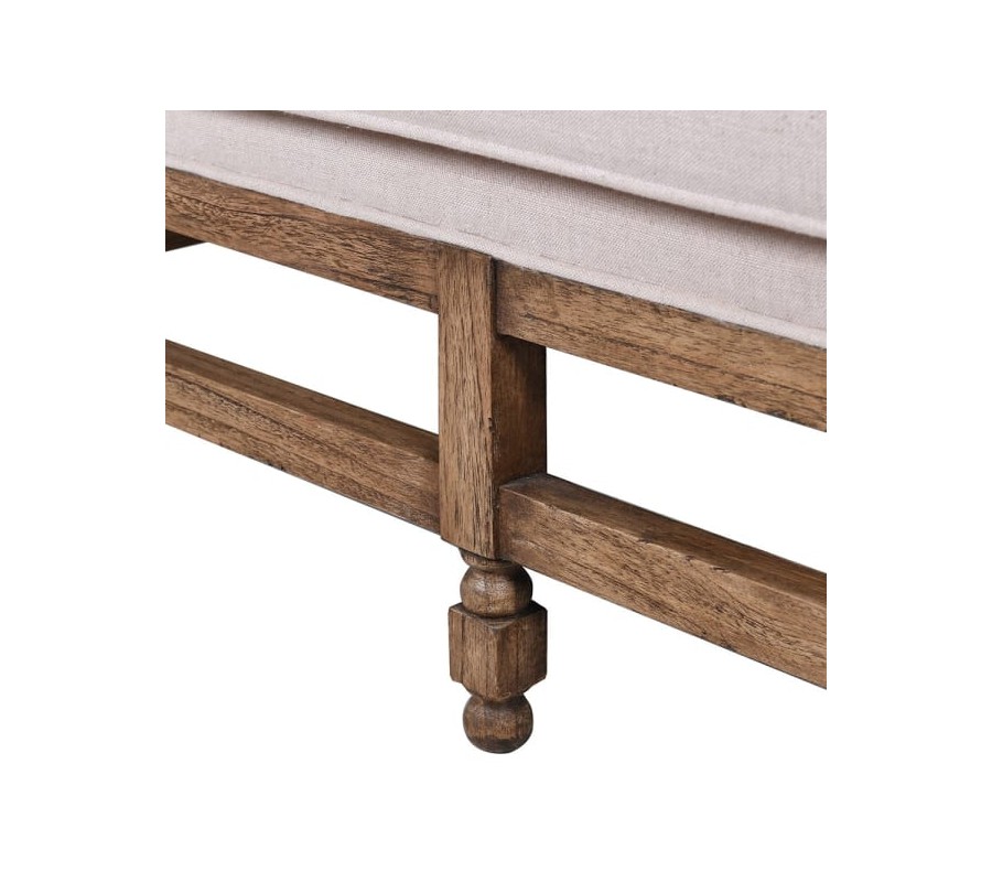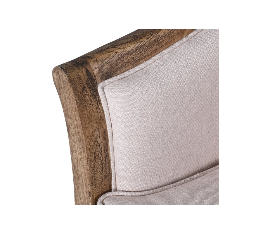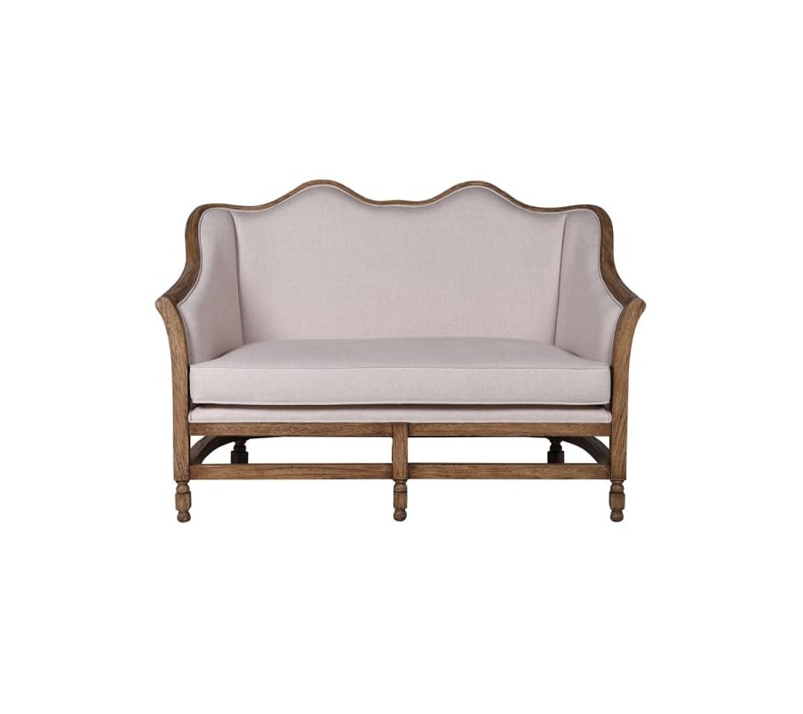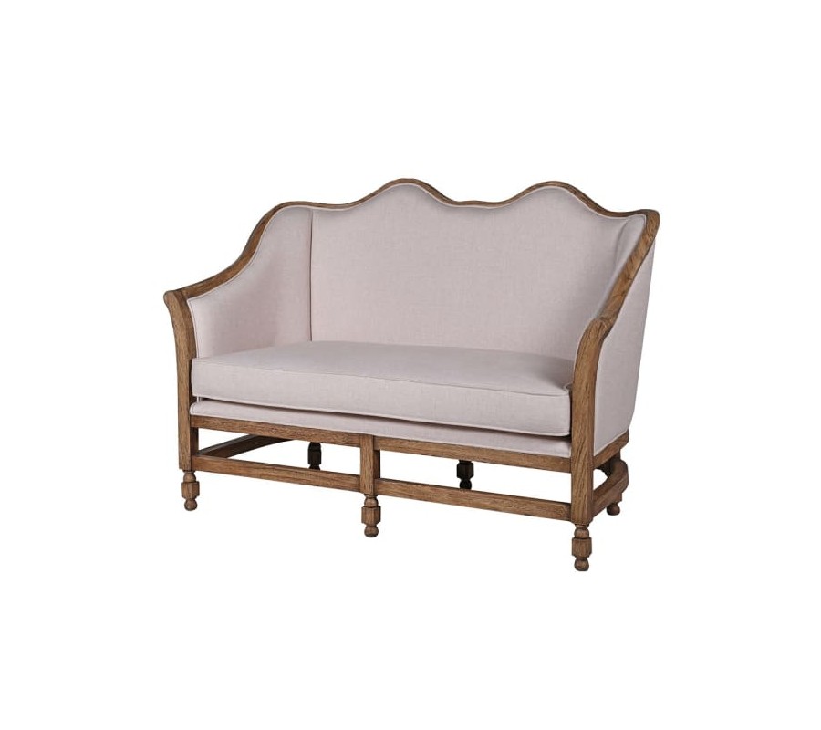 Operadlo je vysoké, zakrivené do oblúkov, poskytujúce komfortnú oporu chrbta. Sedadlo je hlboké, rovné a dostatočne široké pre pohodlné sedenie dvoch osôb. Obe časti sú bohato čalúnené a pokryté kvalitným ľanovým poťahom v jemnom staroružovom odtieni. Povrch látky je mäkký, ale zároveň dostatočne odolný, pričom štruktúra ľanu pridáva sedačke prirodzený a autentický rustikálny vzhľad.