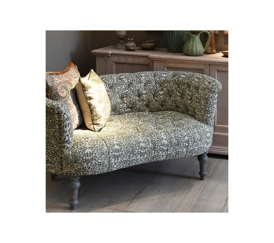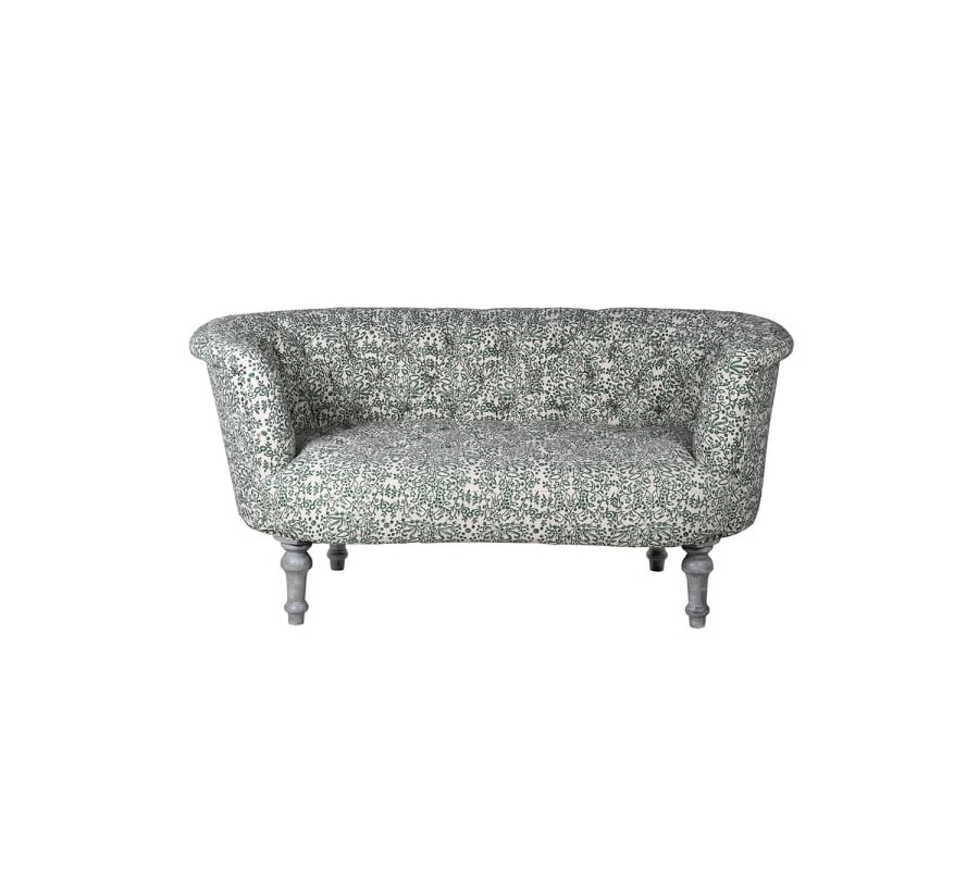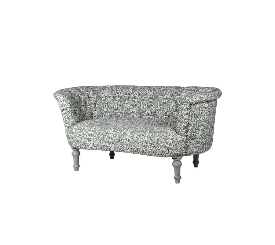 Dvojmiestna sedačka Samie má elegantný zaoblený tvar s jemnými prechodmi medzi sedacou časťou, opierkami na ruky a chrbtovou opierkou. Poťah pokrýva celý povrch sedačky vrátane sedacej a chrbtovej časti. Poťah je vyrobený z bavlny, zdobený paisley vzorom, pripomínajuci jemný rastlinný vzor v odtieňoch zelenej na svetlom, krémovom podklade. Tento vzor dodáva sedačke orientálny nádych a robí ju jedinečnou.