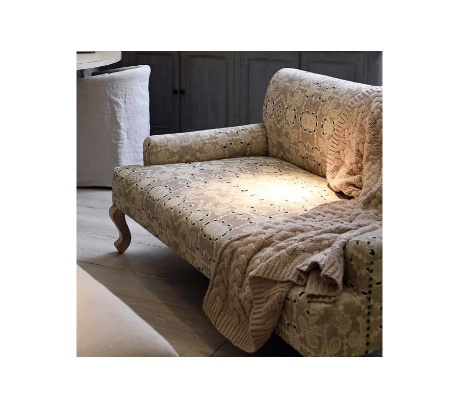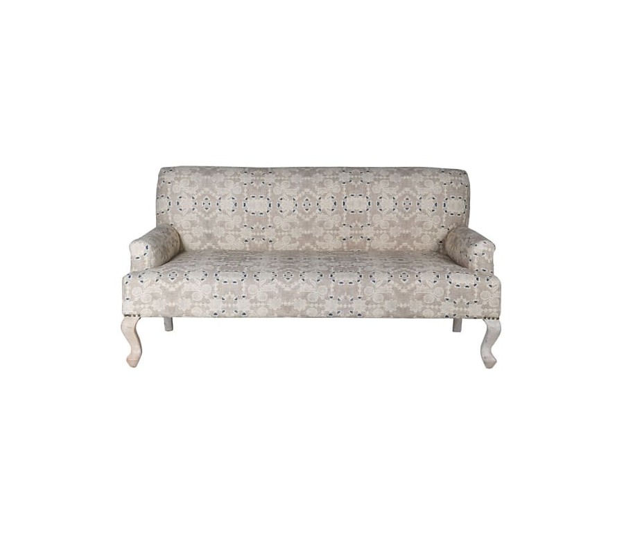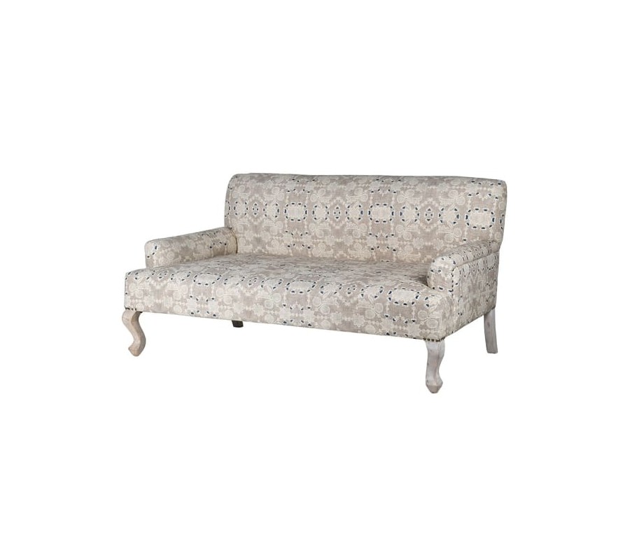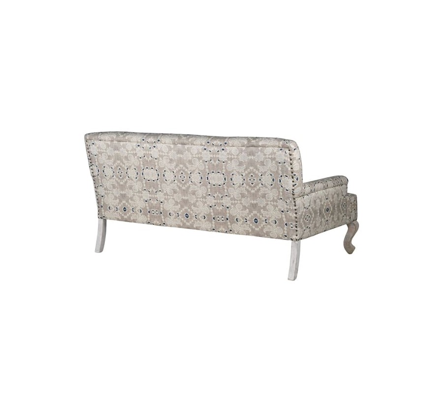 Nožičky sedačky sú vyrobené z dreva a majú elegantný, zaoblený dizajn s jemným oblúkom smerom von, čo dodáva nábytku ľahkosť a šarm. Povrch nožičiek má patinovaný vzhľad v svetlej, bielej až krémovej farbe, čo ešte viac podčiarkuje vintage charakter sedačky.