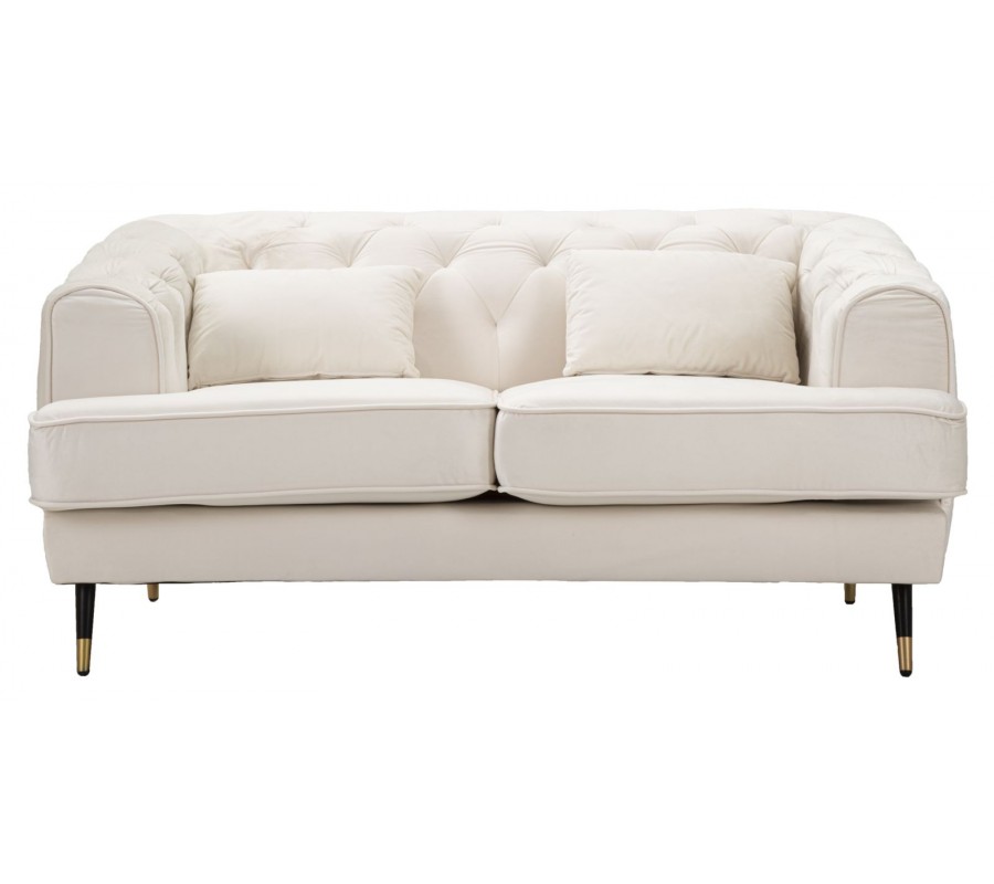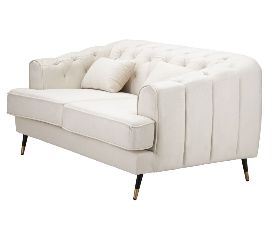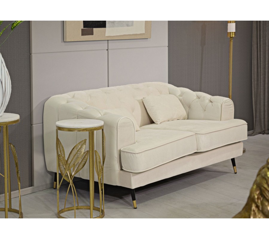 Elegantná dvojsedačka Lana v art deco a glamour štýle prináša luxus a sofistikovanosť do každého interiéru. Jemný zamatový poťah v krémovej farbe pôsobí nadčasovo a zároveň vytvára mäkký, príjemný povrch, ktorý zvýrazňuje exkluzívny dizajn tohto kúsku.
