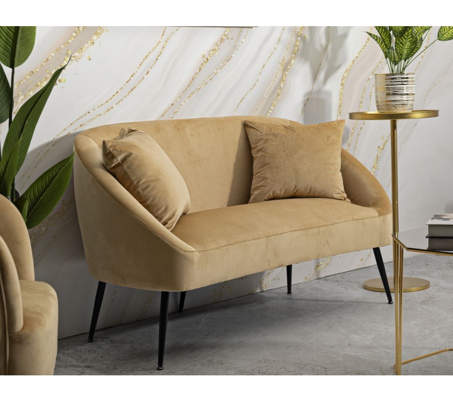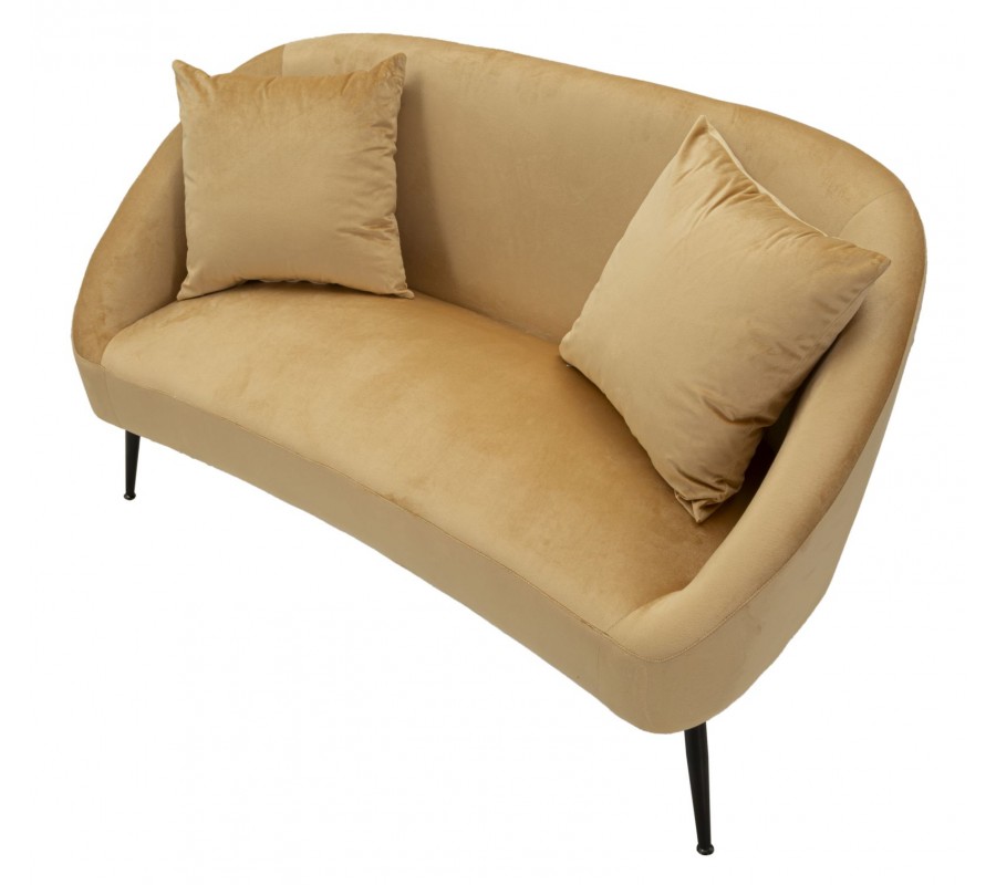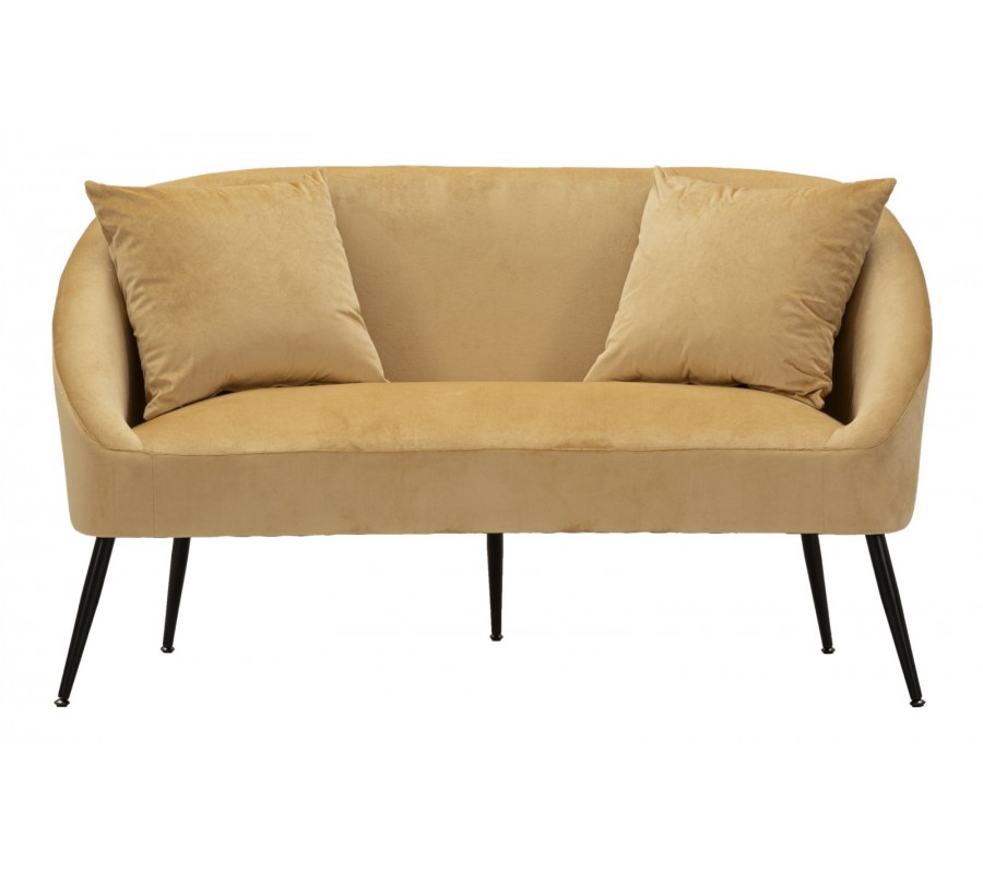 Dizajnová moderná sedačka Cally so zamatovým poťahom v okrovej farbe s dvomi vankúšmi 137 cm