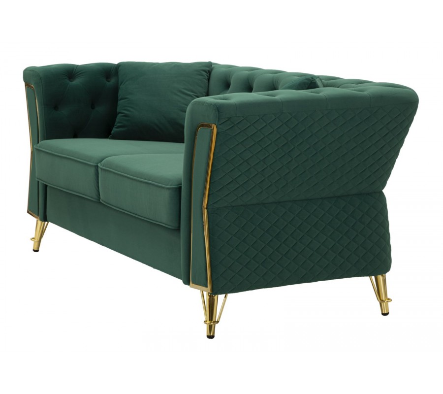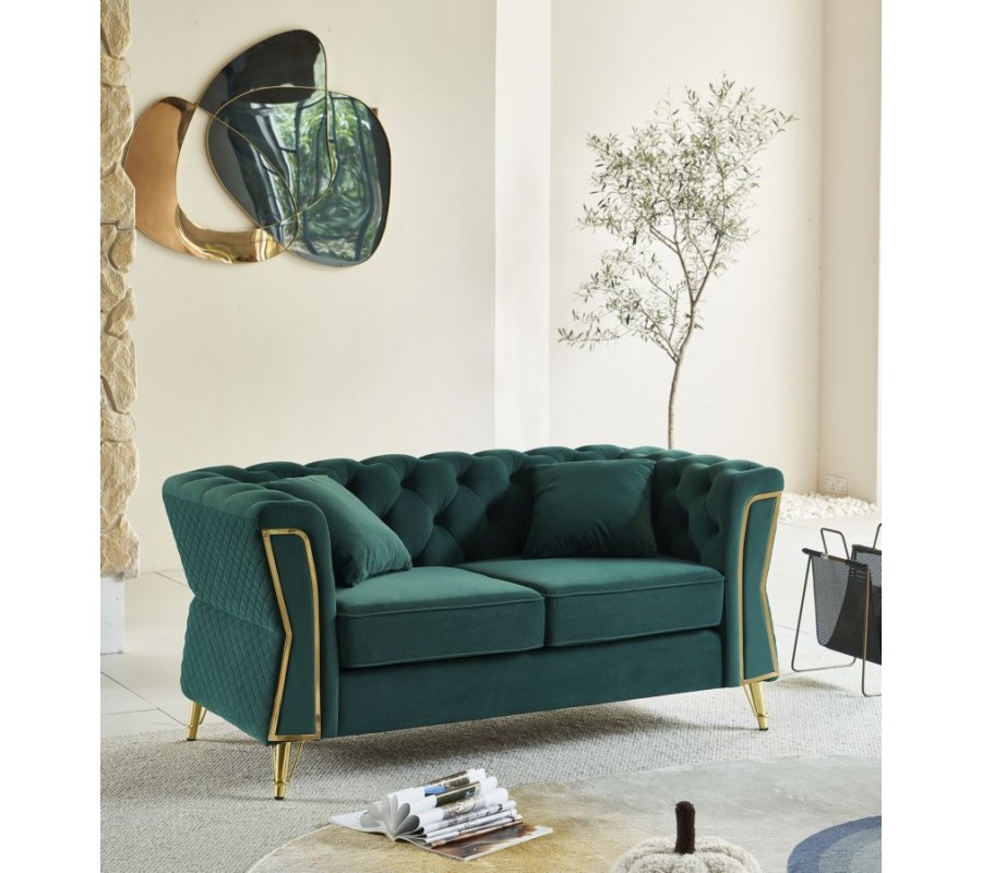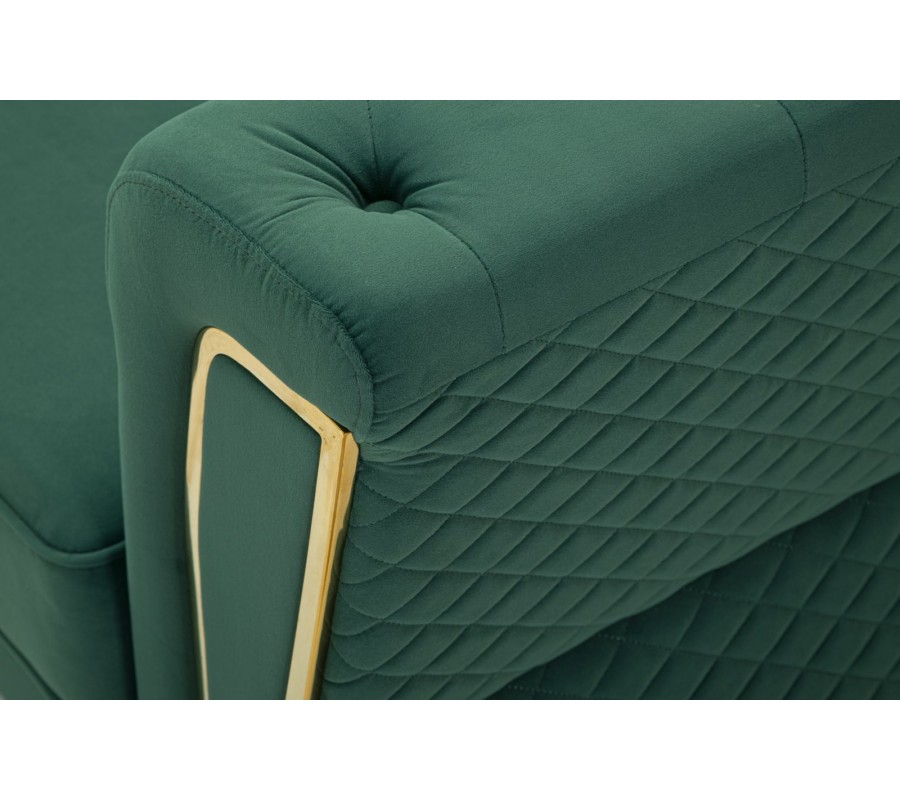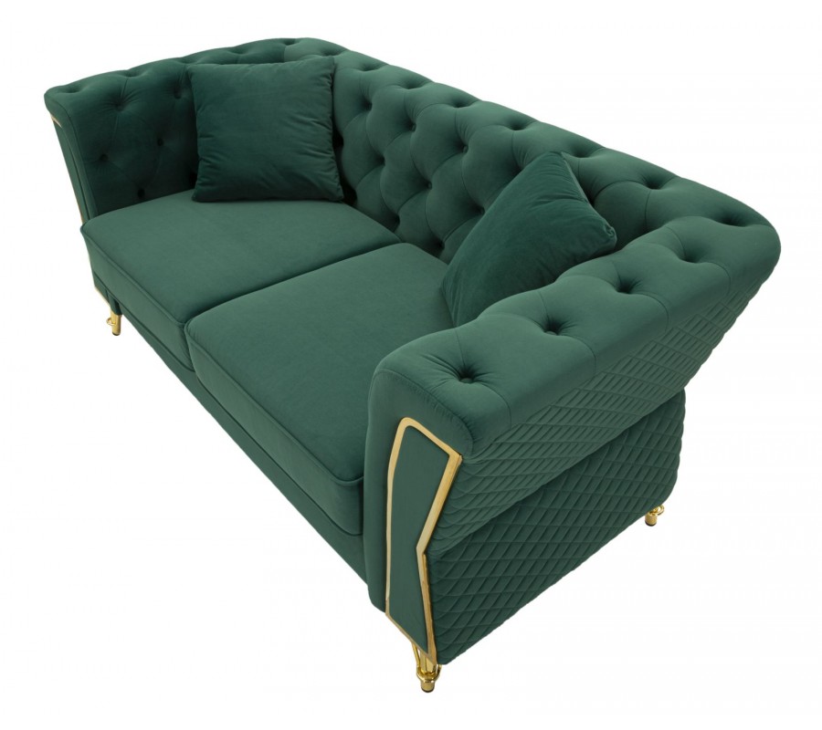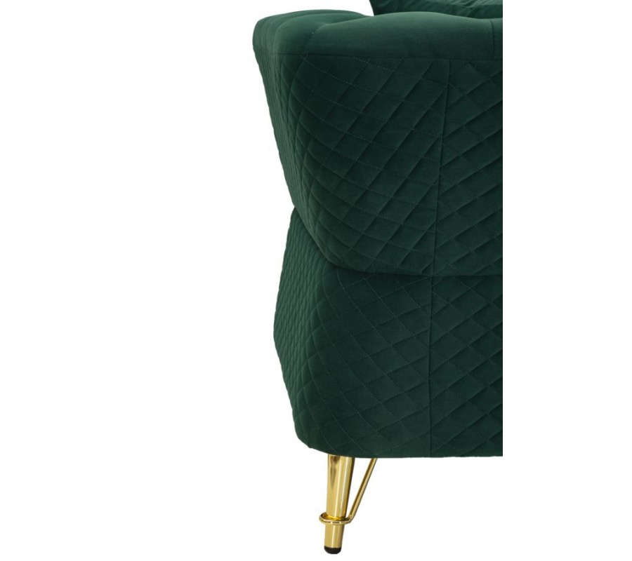 Dvojmiestna sedačka Velaria prináša do interiéru nádych luxusu s kombináciou zamatového čalúnenia a prepracovaných detailov. Tmavo zelená látka s jemným leskom zvýrazňuje jej sofistikovaný vzhľad, zatiaľ čo operadlo a vnútorné strany opierok zdobí chesterfield prešívanie, ktoré pridáva nábytku hĺbku a elegantnú textúru. Vonkajšie boky sú dekorované diamantovým vzorom, ktorý zdôrazňuje precízne spracovanie a dodáva sedačke exkluzívny vzhľad.