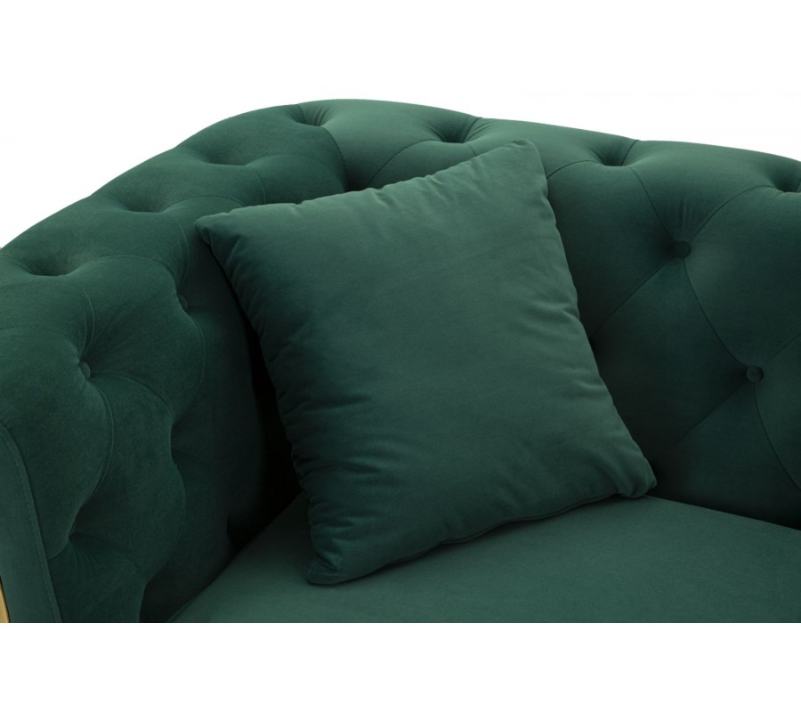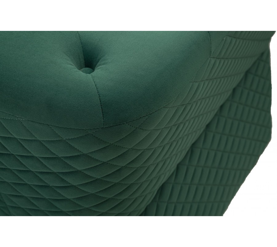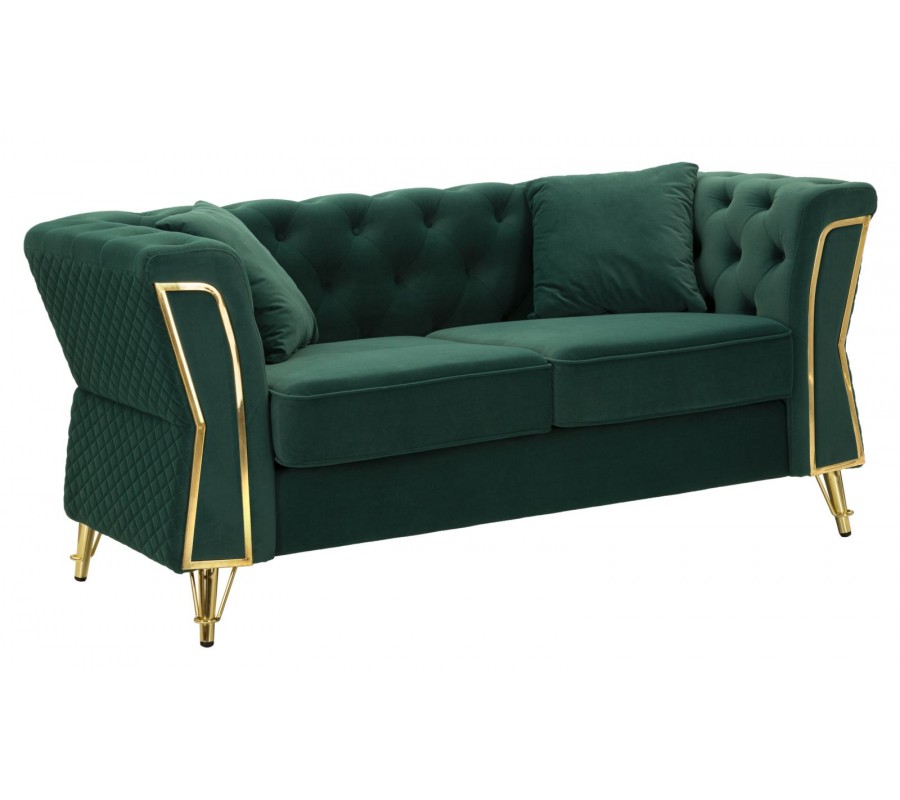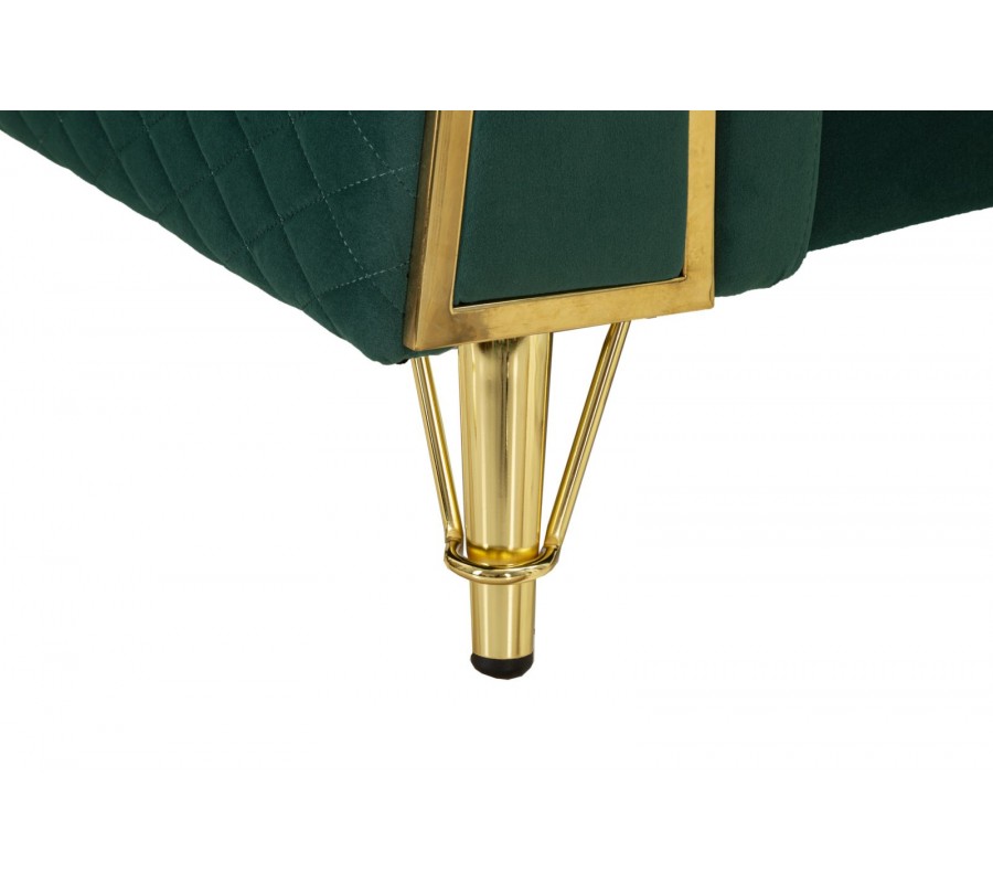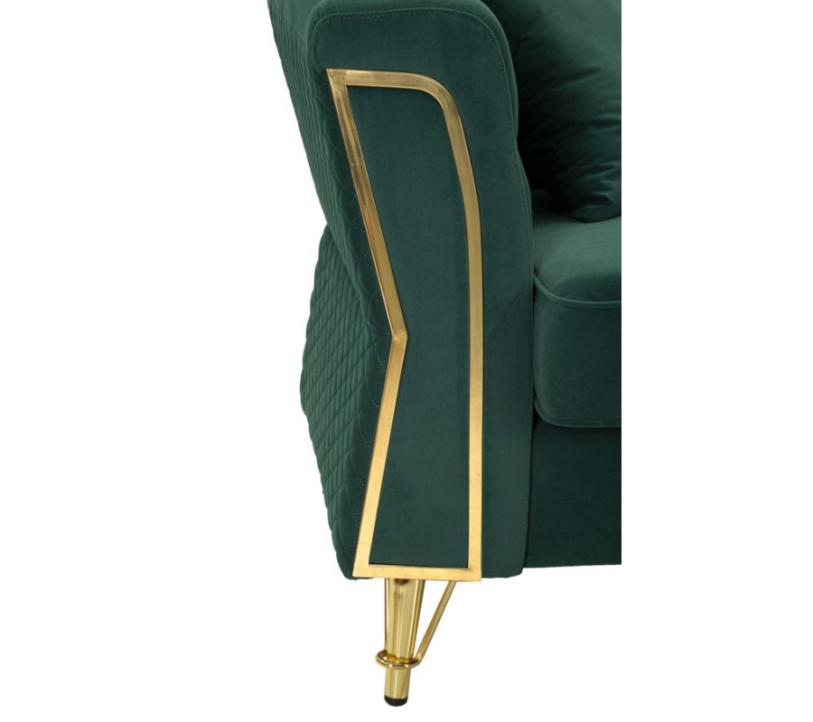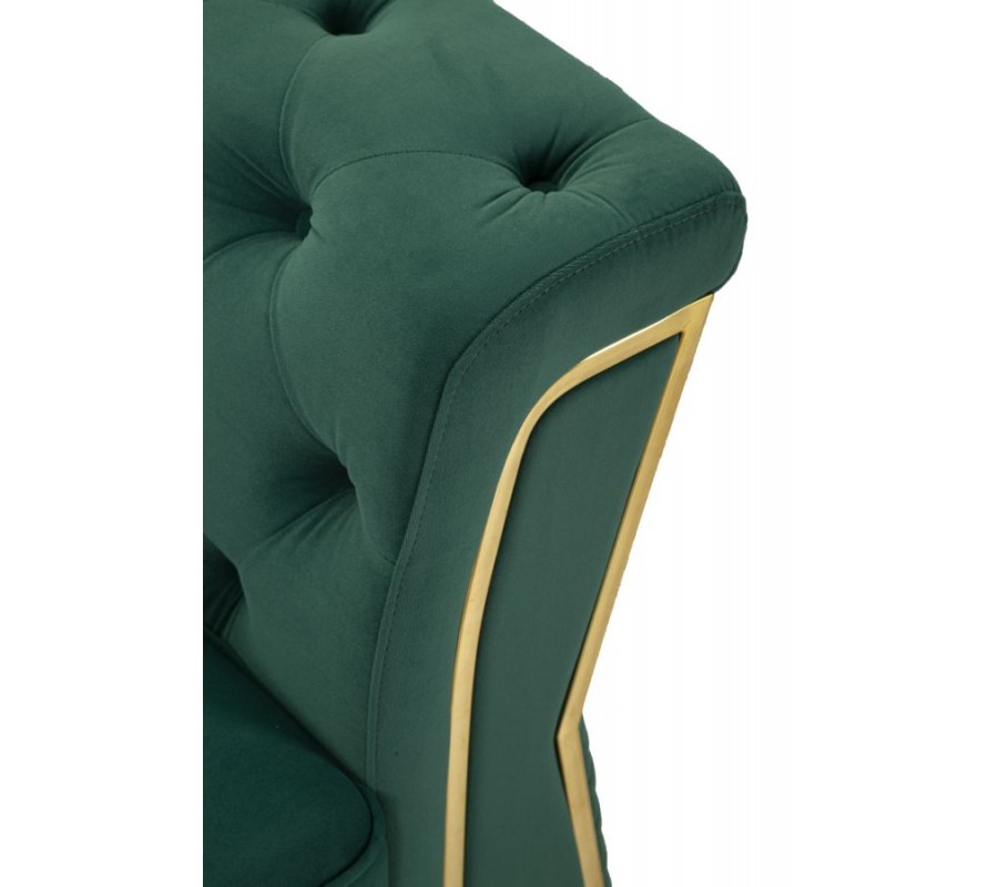 Dvojmiestna sedačka Velaria prináša do interiéru nádych luxusu s kombináciou zamatového čalúnenia a prepracovaných detailov. Tmavo zelená látka s jemným leskom zvýrazňuje jej sofistikovaný vzhľad, zatiaľ čo operadlo a vnútorné strany opierok zdobí chesterfield prešívanie, ktoré pridáva nábytku hĺbku a elegantnú textúru. Vonkajšie boky sú dekorované diamantovým vzorom, ktorý zdôrazňuje precízne spracovanie a dodáva sedačke exkluzívny vzhľad.
