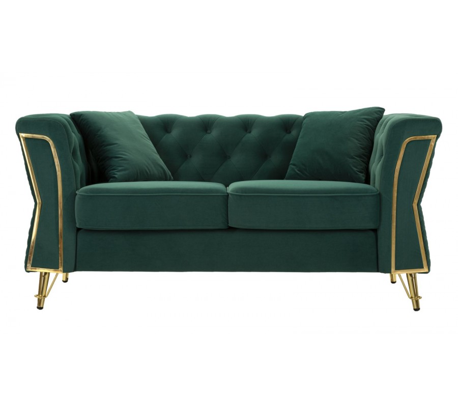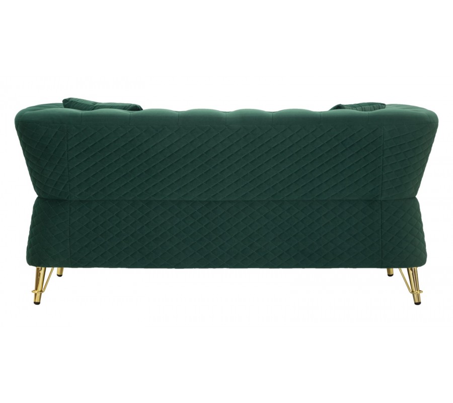 Glamour zelená dvojmiestna sedačka Velaria so zamatovým čalúnením s prešívaním chesterfield na operadle a zlatými detailmi 162cm