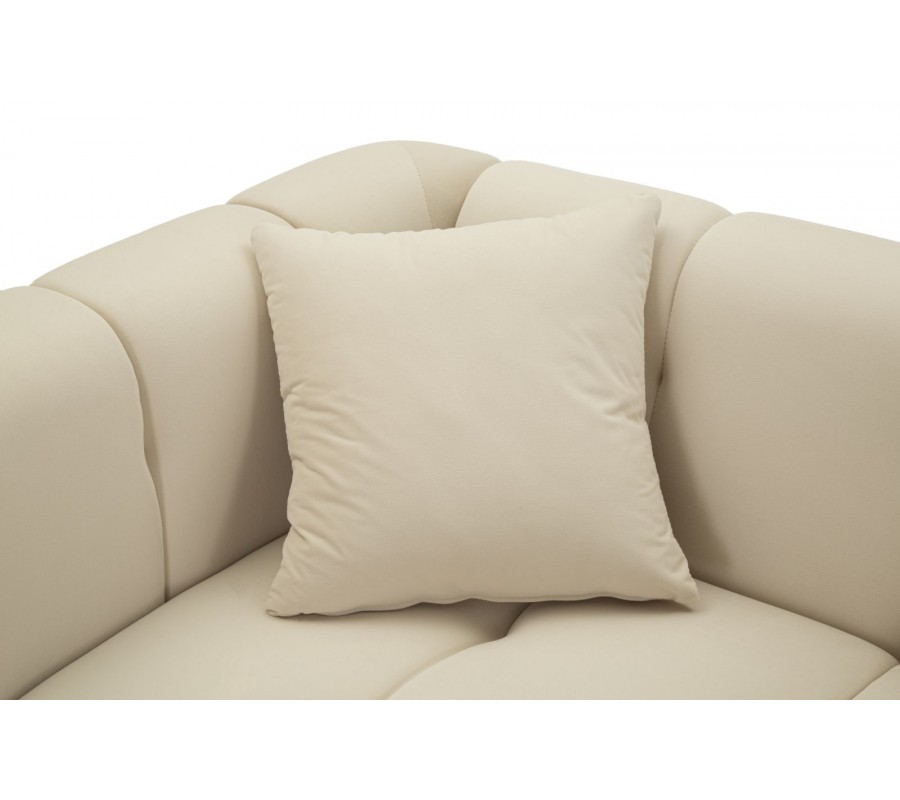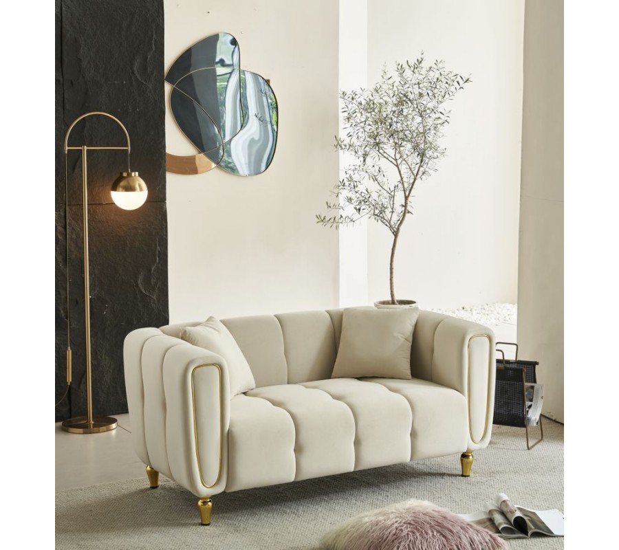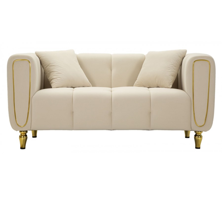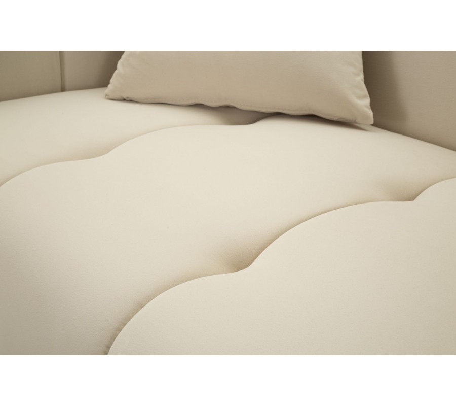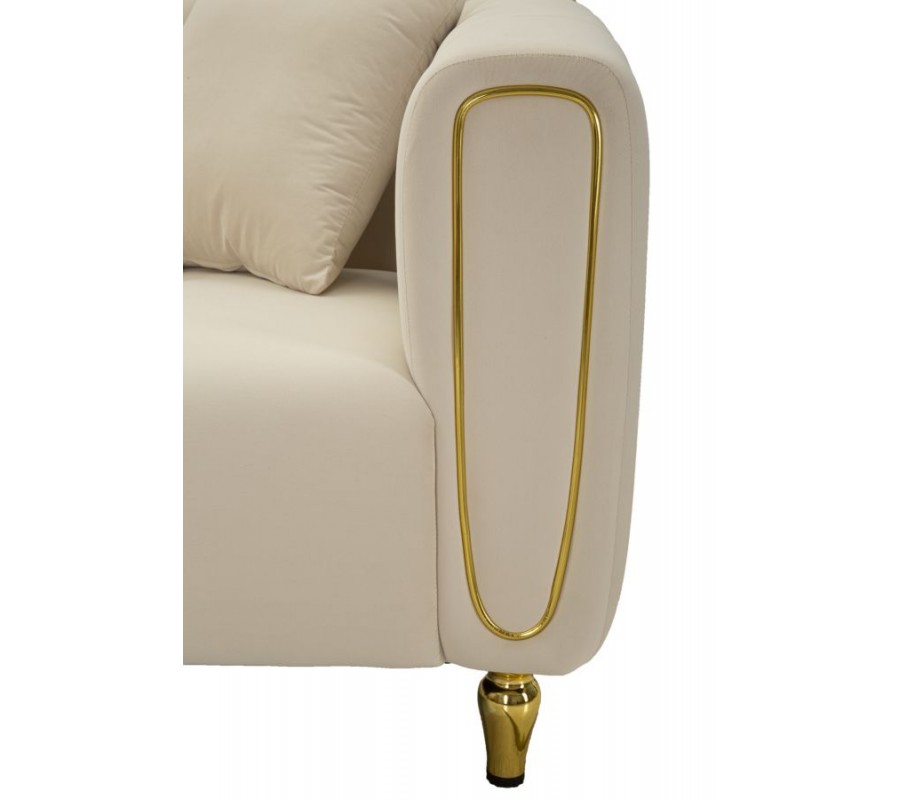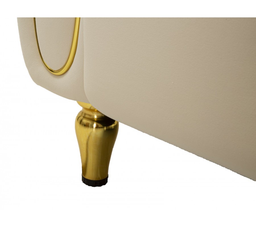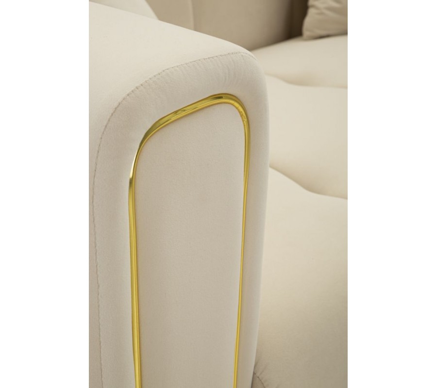 Pevný drevený rám pokrýva mäkké penové čalúnenie, ktoré vám zaručí maximálne pohodlie. Textilný poťah pripomína zamat a je vyrobený z mikrovlákna, ktoré je mimoriadne odolné a nenáročné na údržbu. Čalúnené časti zdobí lineárne prešívanie s hlbokými bodmi, ktoré zdôrazňuje mäkkosť sedačky a dodáva jej útulný vzhľad. Prednú stranu opierky zdobí oválna silueta, zdôrazňujúca jej tvar. Dekoratívny prvok má rovnaké zlaté prevedenie ako kovové nožičky a v kombinácii s krémovou farbou poťahu pôsobí sofistikovaným dojmom.