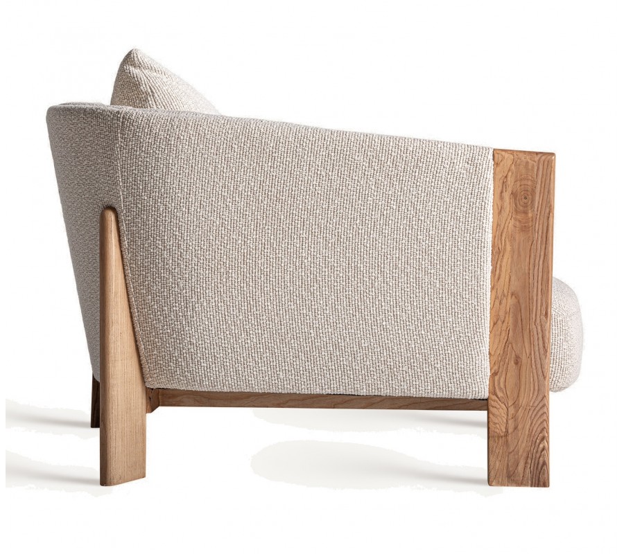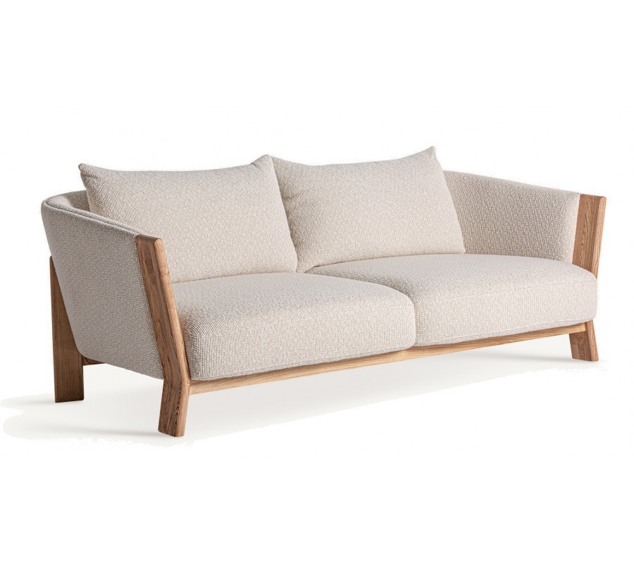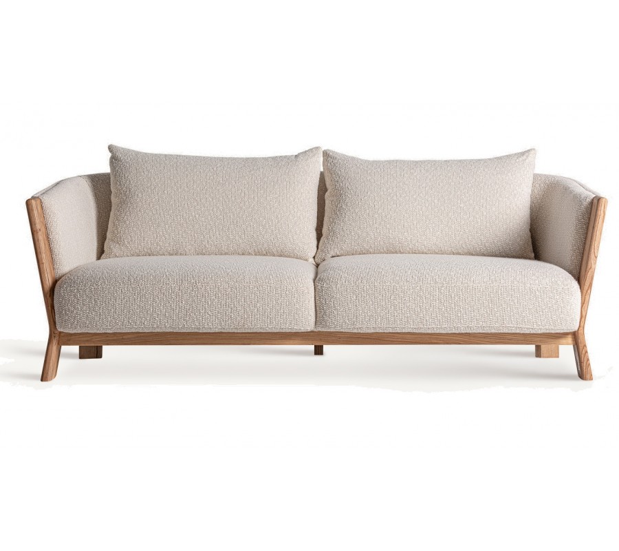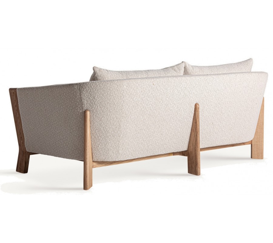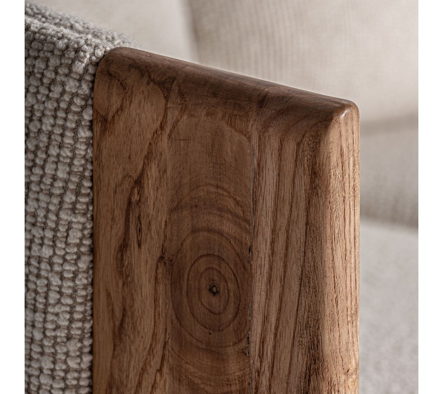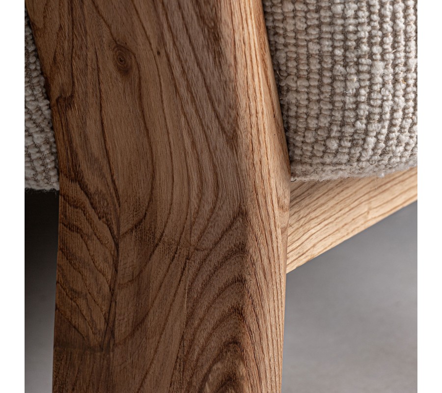 Stabilnú konštrukciu tvorí masívne dubové drevo v prírodnom hnedom odtieni so zachovanou prirodzenou štruktúrou, ktorá zvýrazňuje autentický charakter sedačky. Rám jemne obopína boky sedačky a plynulo prechádza do opierok na ruky, ktoré sú mierne zošikmené pre maximálny komfort. Pevnosť a odolnosť zabezpečuje päť stabilných nožičiek, pričom predný pár je elegantne zošikmený. Zadné nožičky nadväzujú na konštrukciu opieracej časti, čím dotvárajú dizajnu vizuálnu ľahkosť.