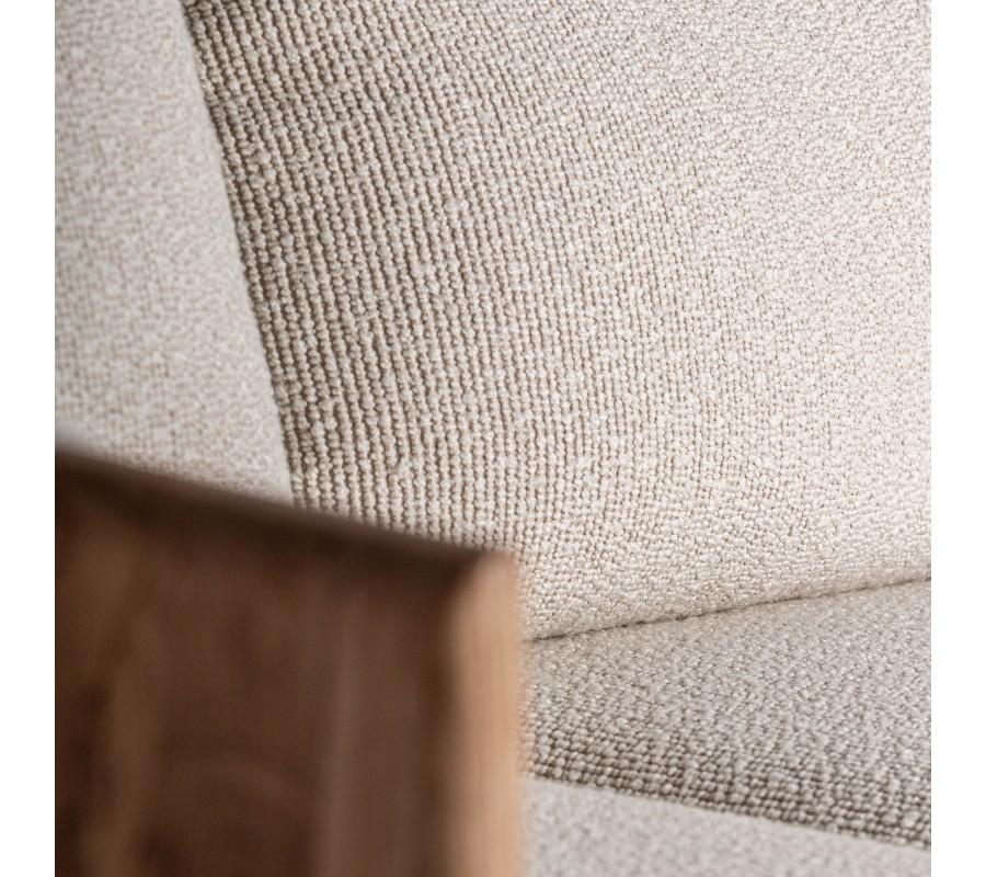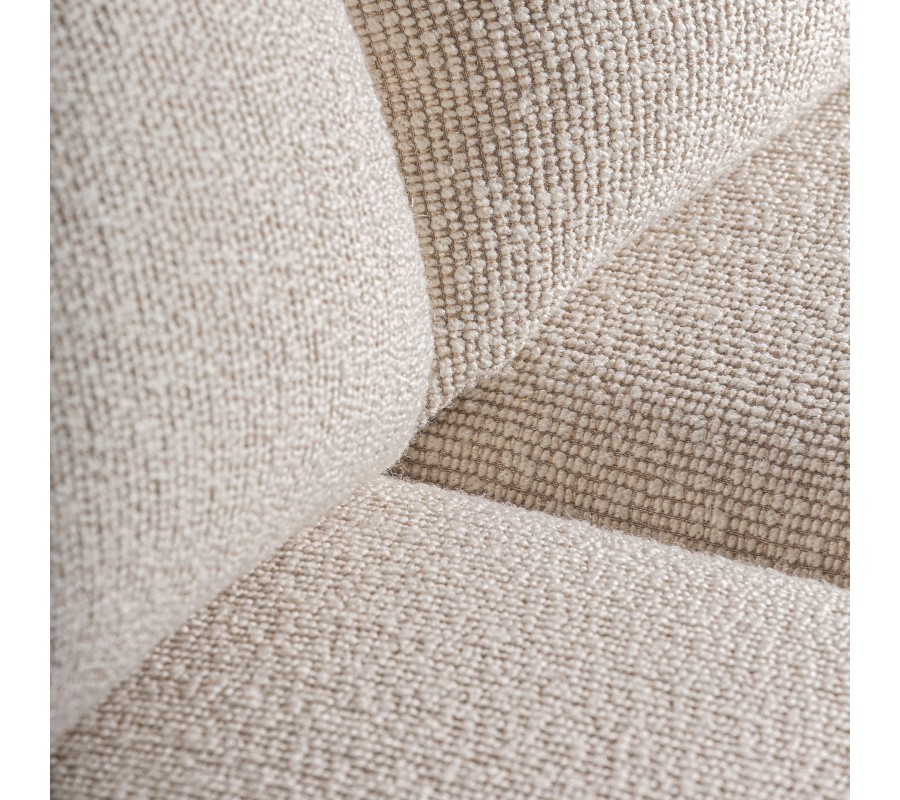 Konštrukcia oblého tvaru, typického pre retro dizajn, je potiahnutá béžovou textíliou. Sedacia dvojmiestna časť disponuje dvomi priestrannými vankúšmi čalúnenými béžovou textúrovanou látkou, ktorá svojou jemnou štruktúrou a neutrálnym odtieňom dodáva sedačke útulný vzhľad. Opieracia časť disponuje dvomi širokými vankúšmi, ktoré poskytujú oporu chrbta a zároveň ladia s celkovým dizajnom.