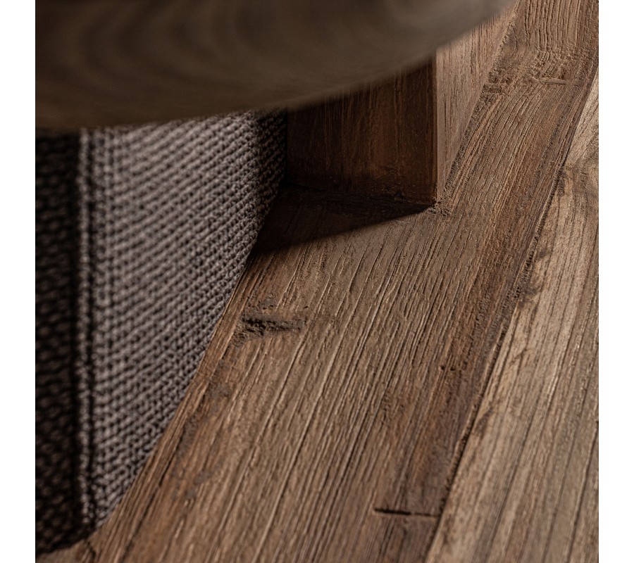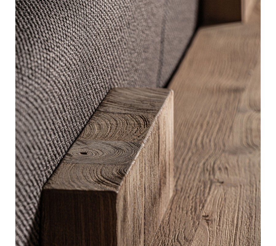 Sedačka stojí na troch masívnych hranoloch, ktoré zabezpečujú pevnosť a vyváženie. Vďaka svojmu neopozeranému dizajnu sa hodí do moderných interiérov, kde dominuje prírodné drevo, ale rovnako dobre zapadne do vidieckych alebo boho priestorov. Perfektne sa kombinuje s drevenými konferenčnými stolíkmi, ratanovými doplnkami alebo dekoračnými vankúšmi v neutrálnych farbách.