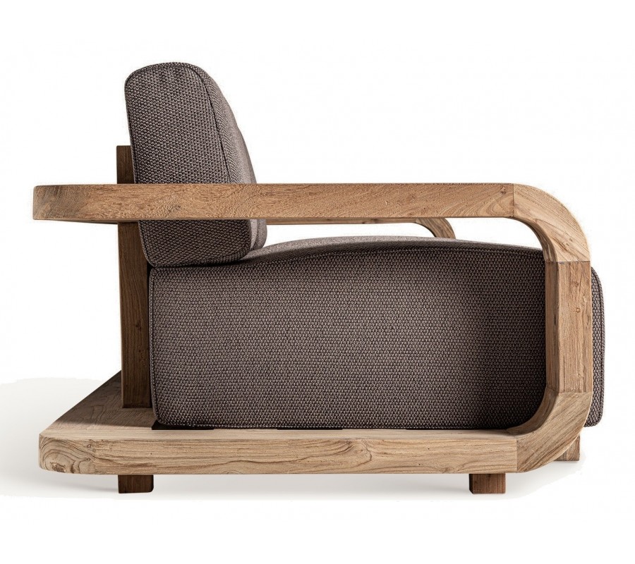 Opierky na ruky sú dominantným prvkom, ich mohutná drevená konštrukcia plynule prechádza z prednej časti do zadnej, pričom spodná doska sa prepojuje s opierkami a vytvára celistvý oblúkový rám. Drevo je naplavené, v prírodnej hnedej farbe, nelakované, čo zachováva jeho výraznú štruktúru letokruhov a prirodzené nedokonalosti. Zadná konštrukcia je prepracovaná do detailov, dve pevné vertikálne dosky sú spojené horizontálnymi tyčami, čím poskytujú oporu operadlu aj celkovú stabilitu.