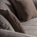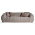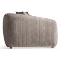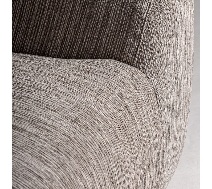 Povrch sedačky zdobí textúrované čalúnenie s jemným lineárnym vzorom v prírodnom taupé odtieni, ktorý pôsobí mäkko, útulne a zároveň luxusne. Výrazná štruktúra látky v kombinácii s decentnou farebnosťou dodáva čalúneniu hĺbku a vizuálny záujem.