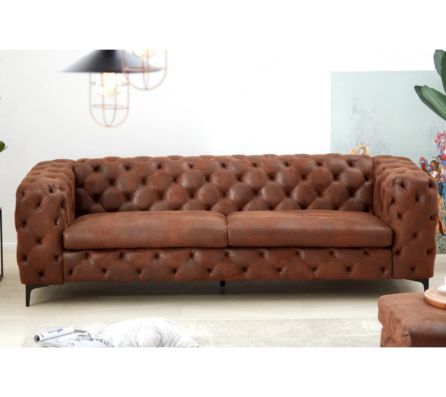 Trojmiestna sedačka Modern Barock s prešívaním v ikonickom chesterfield štýle v sebe spája eleganciu klasického dizajnu s modernými prvkami. Dominantným prvkom je hlboké gombíkové prešívanie po celom obvode, vrátane opierok na ruky, operadla aj spodnej časti.