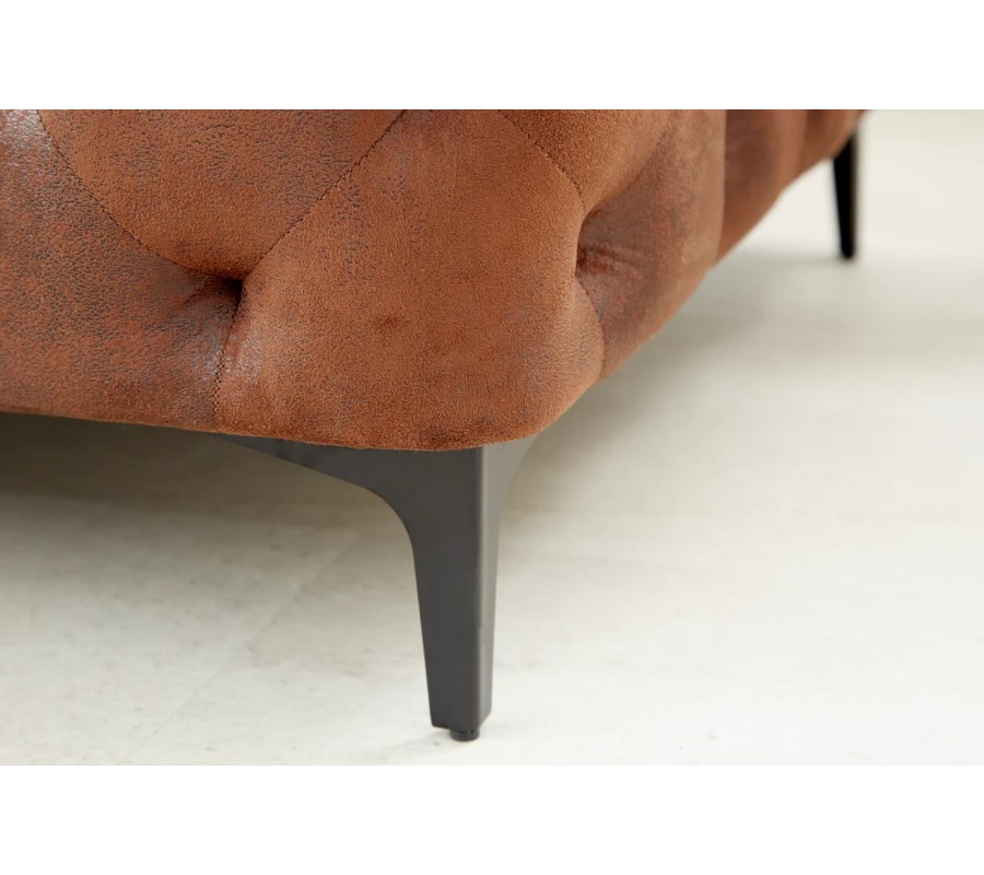 Kovové nožičky v čiernej farbe sú štíhle, mierne kónické a kontrastujú s robustným telom sedačky, čím opticky odľahčujú celkový objem.