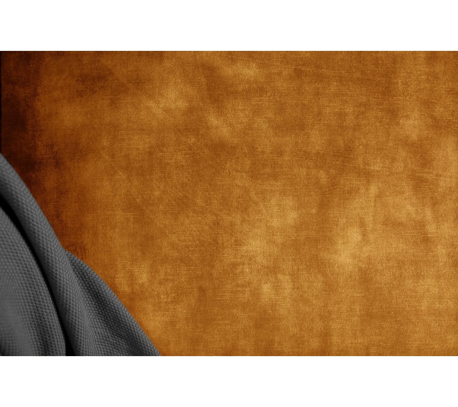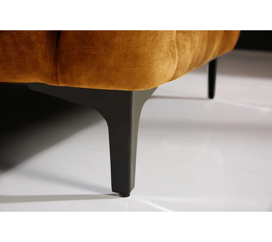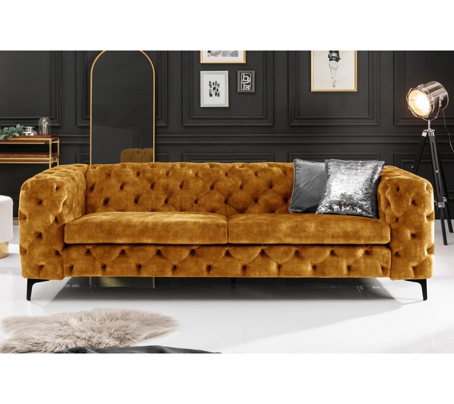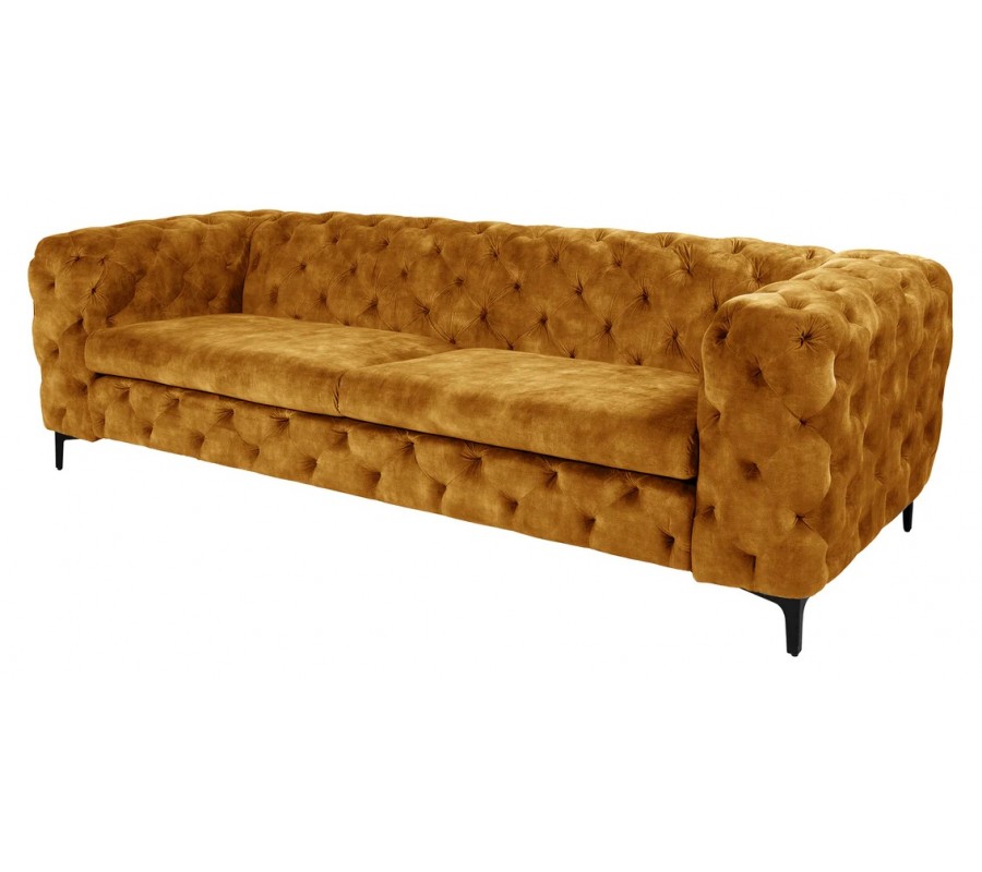 Obdĺžniková konštrukcia je čalúnená jemnou zamatovou poťahovou látkou v sýtej horčicovej farbe, ktorá povrchu dodáva zamatový lesk, zároveň je príjemná na dotyk. Dvojica obdĺžnikových vankúšov tvorí pohodlnú sedaciu časť, zatiaľ čo vysoké operadlo a dve opierky na ruky sú zdobené zapustenými gombíkmi, tento detail je typický pre chesterfield štýl.