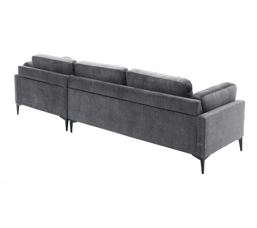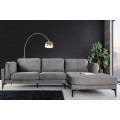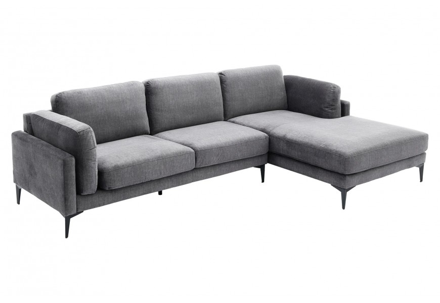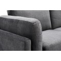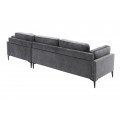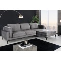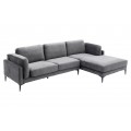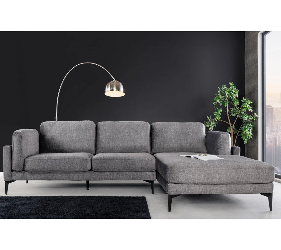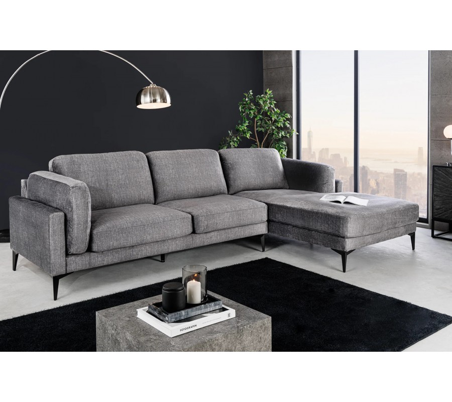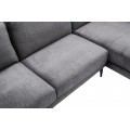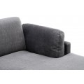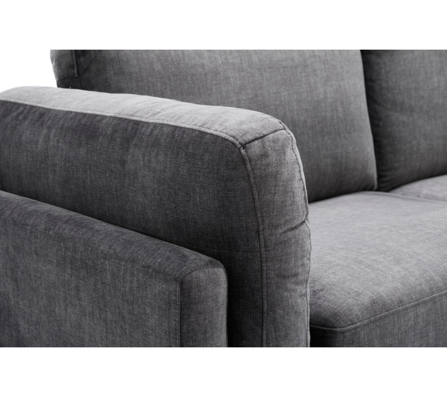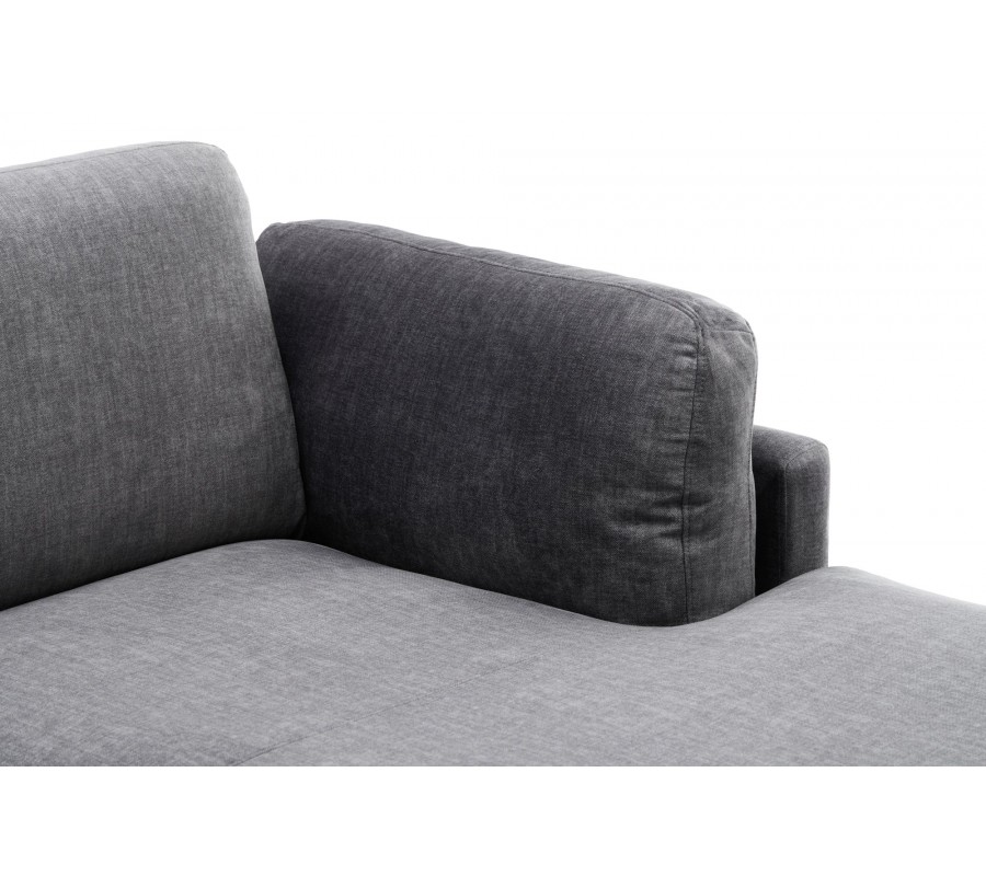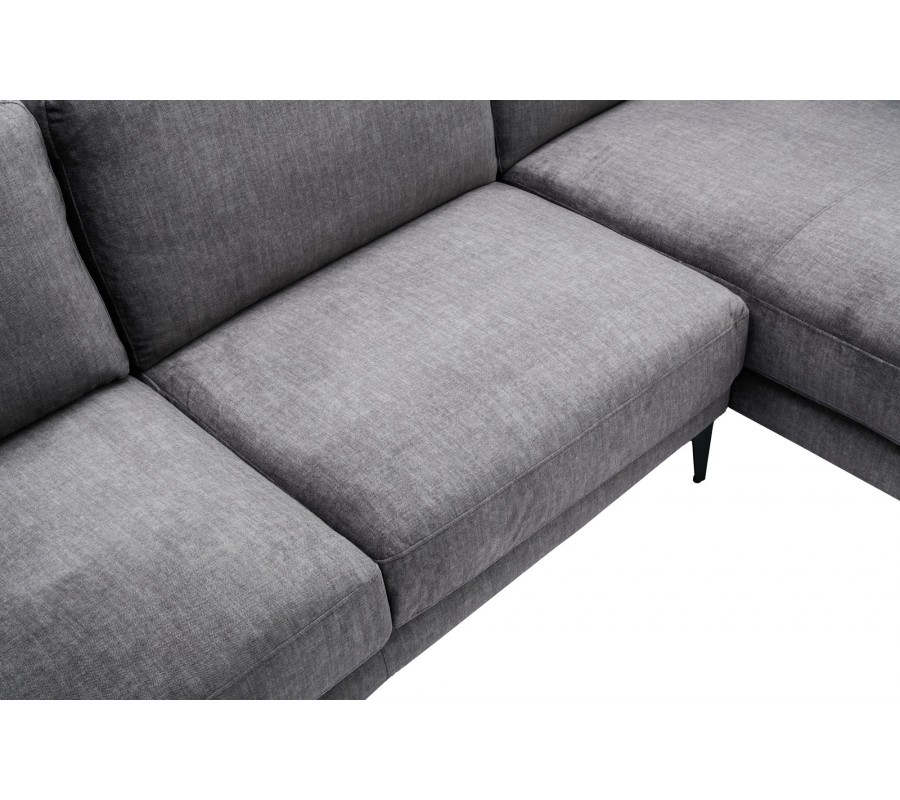Obdĺžniková štvormiestna konštrukcia je čalúnená jemnou látkou v sýtom sivom farebnom odtieni, ktorý dodáva povrchu útulný vzhľad, zároveň je príjemný na dotyk. Je vybavená tromi obdĺžnikovými operadlovými vankúšmi a dvomi bočnými, tie elegantne dopĺňajú opierky na ruky. Vďaka predĺženej časti na ležanie na lavej strane poskytuje sedačka maximálne pohodlie.