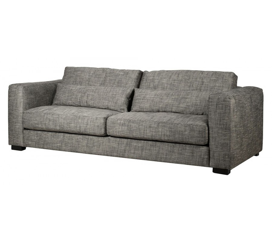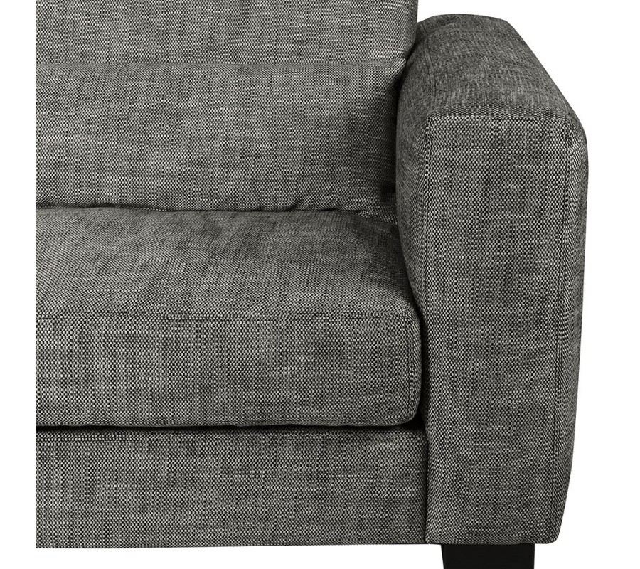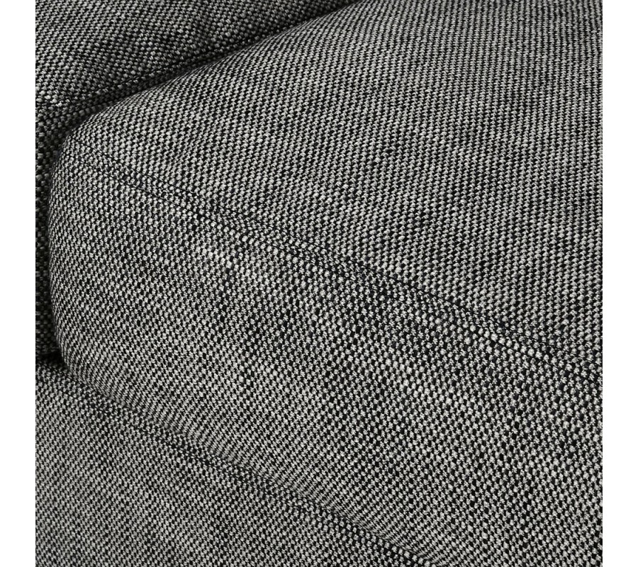 Luxusná trojmiestna moderná sedačka Ecila zaujme svojím čistým obdĺžnikovým tvarom, ktorý podčiarkuje minimalistický dizajn a precízne línie. Povrch tvorí čalúnenie z kvalitného eko materiálu v sivej farbe s jemnou textúrou, ktorá pôsobí prirodzene a zároveň elegantne. Materiál je z látky vyrobenej z recyklovaného textilu a plastových fliaš, čo je šetrné k životnému prostrediu. Konštrukcia je doplnená o masívne čierne nožičky z kaučukového dreva, ktoré dodávajú stabilitu a decentný kontrast.