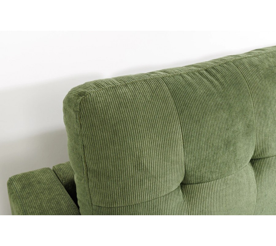 Vďaka kombinácii zamatového efektu vrúbkovaného poťahu a výraznej zelenej farby sa sedačka hodí do moderných, škandinávskych aj retro interiérov, najmä v kombinácii so svetlým drevom, čiernym kovom alebo béžovými textíliami.