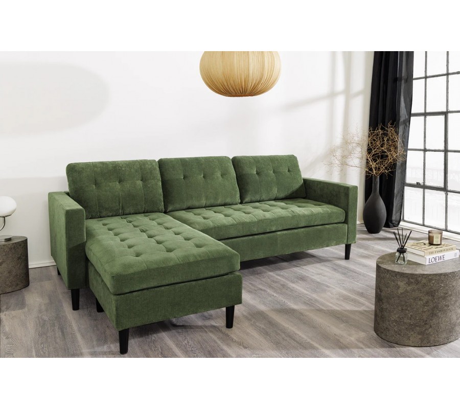 Dizajnová trojmiestna univerzálna rohová sedačka Sallen s menčestrovým zeleným poťahom a prešívaním 220 cm