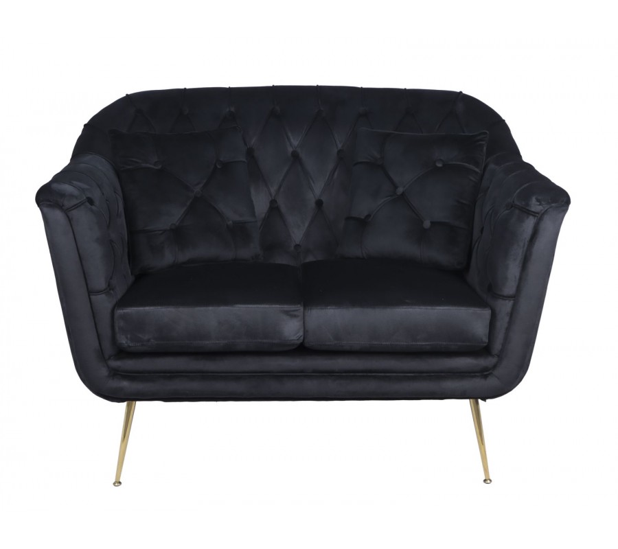 Luxusná art deco dvojmiestna čierna čalúnená sedačka Melisa so zamatovým prešívaným poťahom a zlatými kovovými nožičkami 130 cm