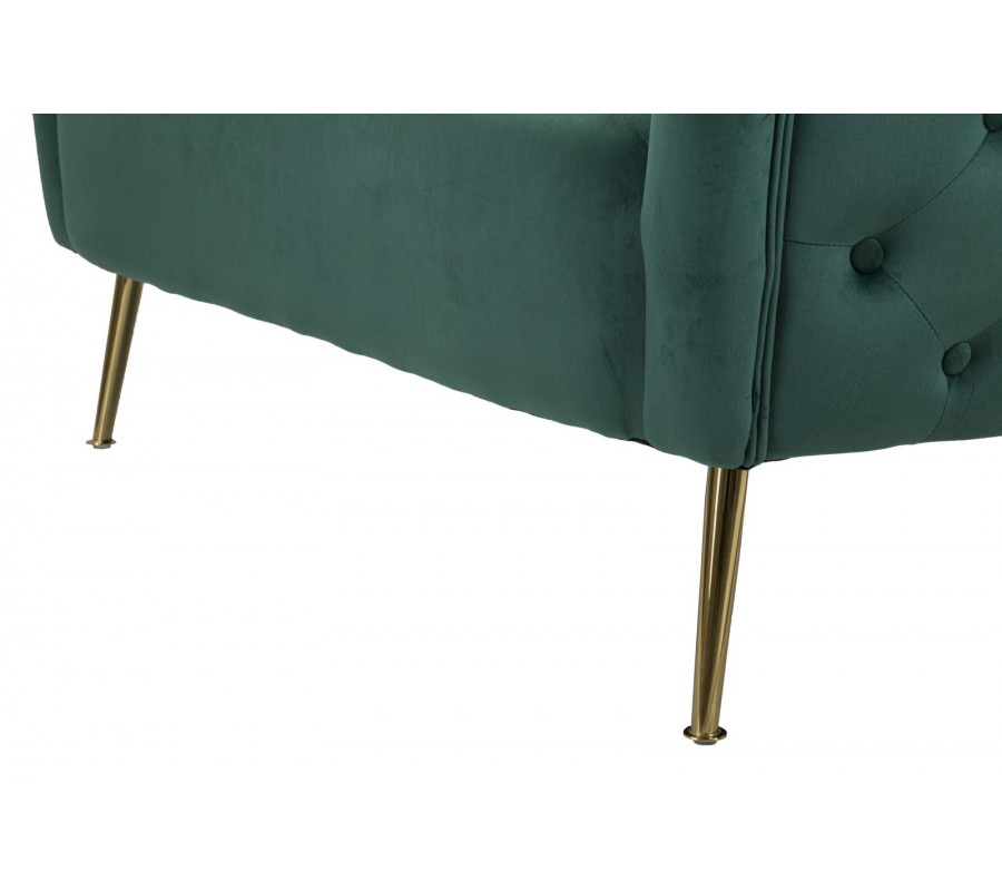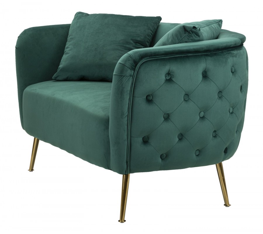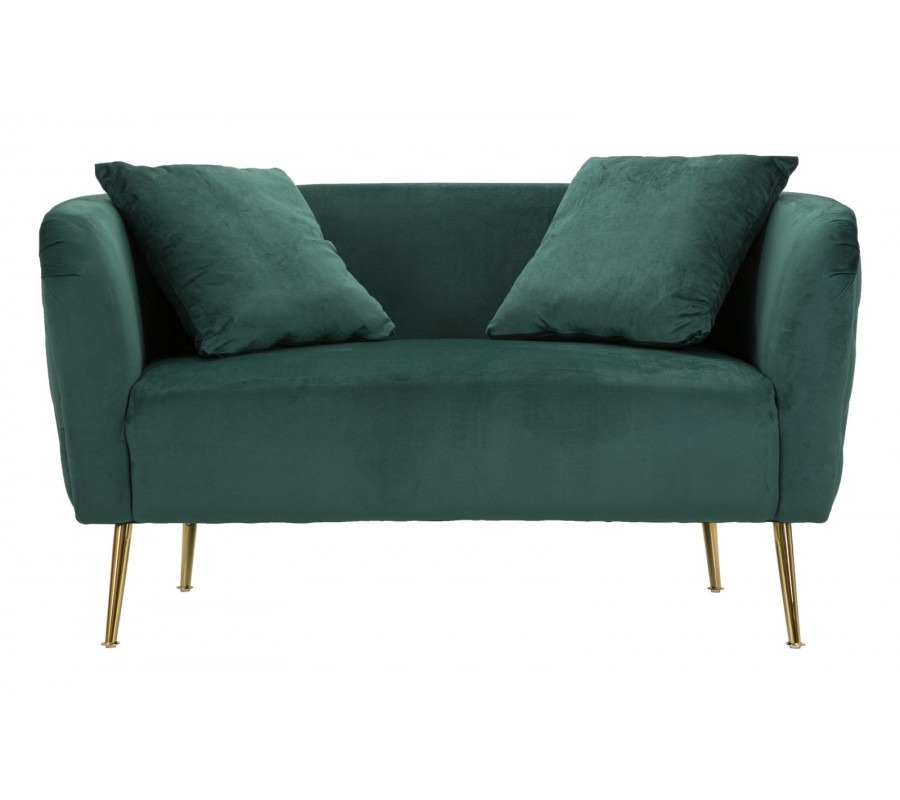 Glamour obdĺžniková zelená zamatová čalúnená dvojmiestna sedačka Lienne s oblými opierkami a zlatými kovovými nožičkami 127 cm