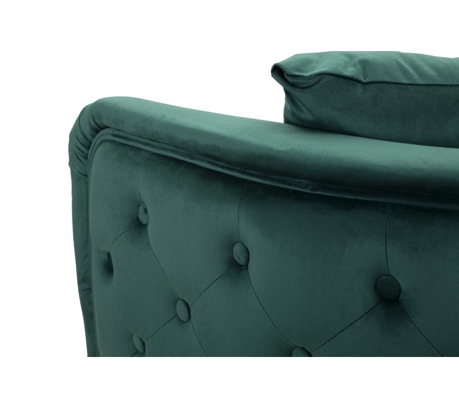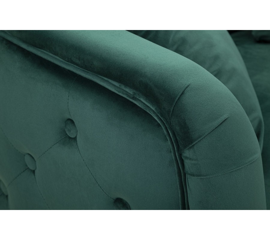 Čalúnená dvojmiestna sedačka Lienne zaujme elegantným obdĺžnikovým tvarom a mäkko zaoblenými bočnými opierkami, ktoré dodávajú komfort a vizuálnu vyváženosť. Sedačka je potiahnutá hladkou textíliou v tmavozelenej farbe, ktorá pôsobí sofistikovane a zároveň hrejivo. Na bočných stranách opierok sa nachádza jemné prešívanie v štýle chesterfield, ktoré pripomína klasickú remeselnú prácu a zároveň podčiarkuje štýl glamour.