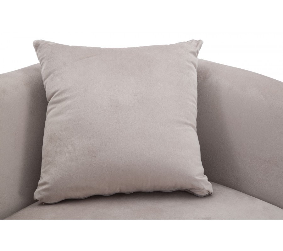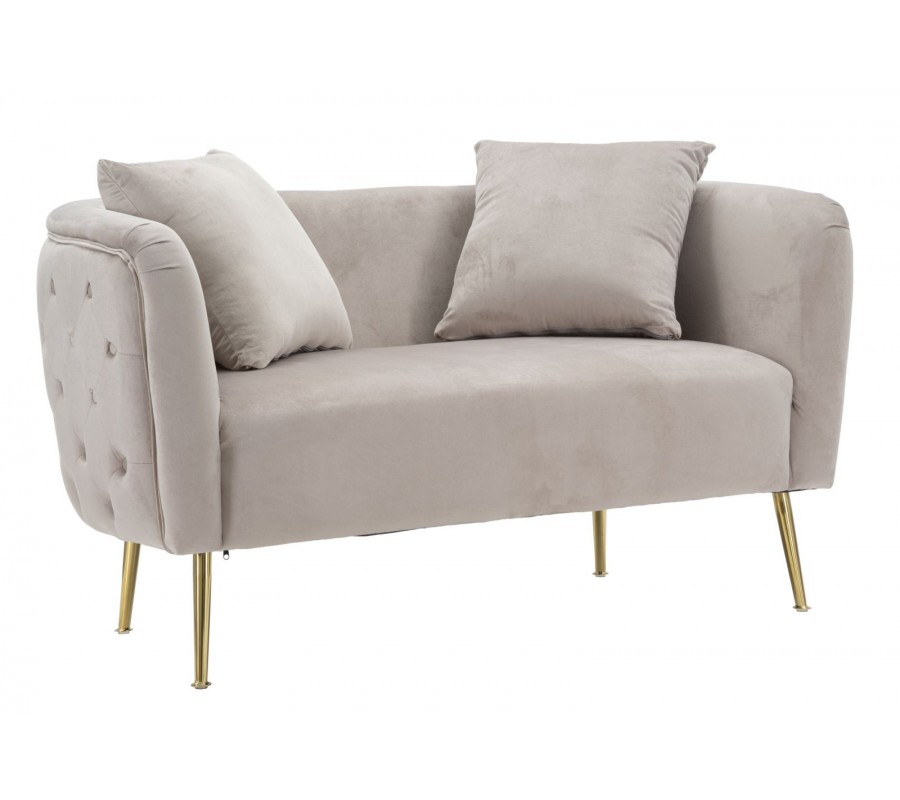 Dvojmiestna sedačka Lienne v sebe spája jemnosť, eleganciu a nadčasový glamour v duchu art deco štýlu. Jej obdĺžnikový tvar dopĺňajú zaoblené bočné opierky, ktoré majú rovnakú výšku ako chrbtová opierka, čím vytvárajú súvislú a kompaktnú siluetu. Celý povrch je potiahnutý jemne lesklým zamatovým poťahom v béžovej farbe, ktorý pôsobí teplo, luxusne a vizuálne zjemňuje celok.