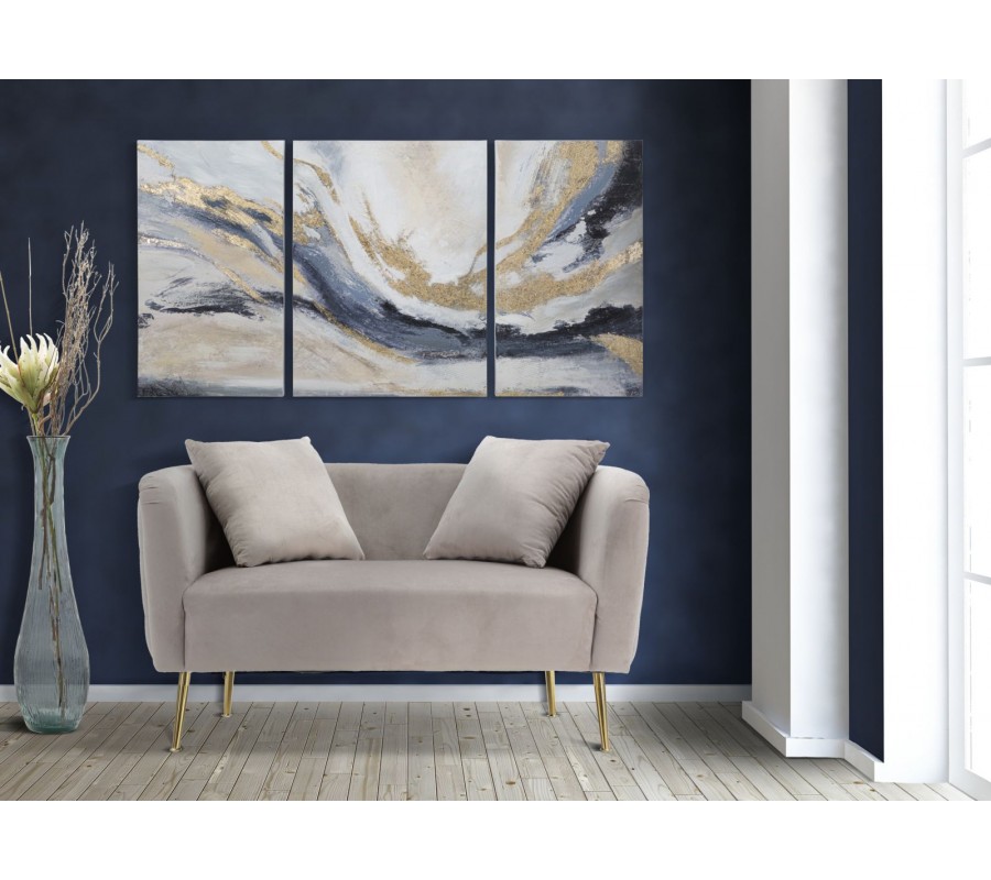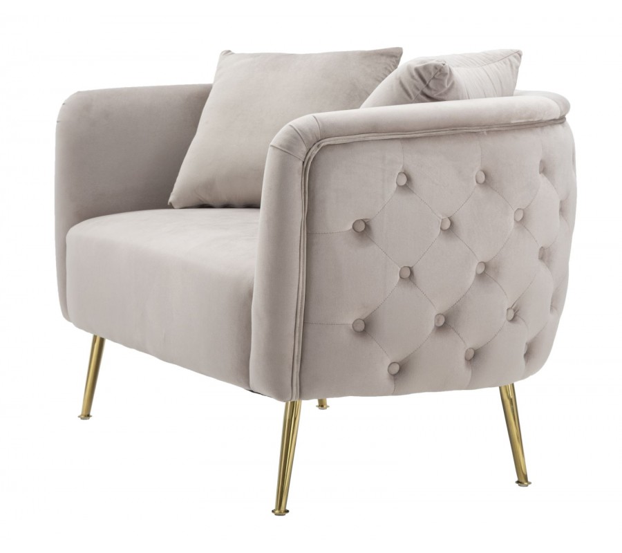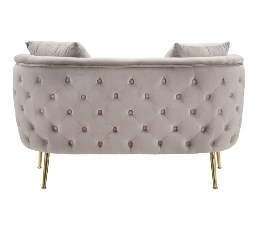 Zadná aj bočné opierky sú zdobené pravidelným vertikálnym prešívaním, ktoré vytvára jemný rytmus a optickú štruktúru po celom obvode sedačky. Dva štvorcové vankúše v rovnakom poťahu zvyšujú komfort a zároveň podčiarkujú celkový vzhľad. Vnútorná konštrukcia z dreva zabezpečuje pevnosť a stabilitu, zatiaľ čo štíhle zlaté kovové nožičky dodávajú celej kompozícii ľahkosť a štýlový nádych.