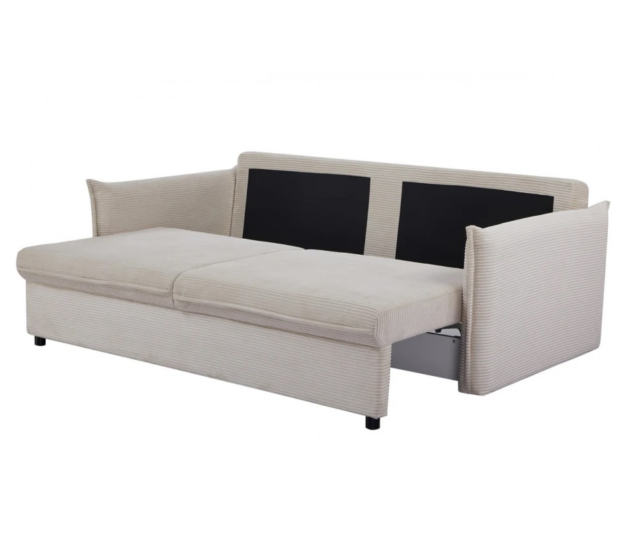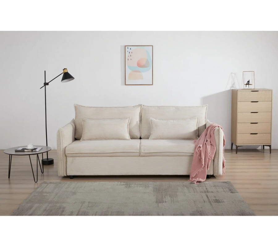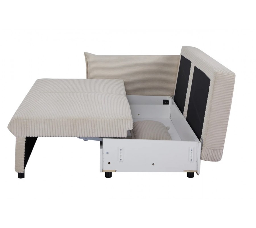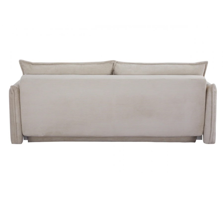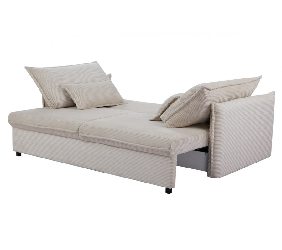 Sedačka obsahuje praktický úložný priestor pod sedadlom, ktorý môžete využiť na odkladanie diek či vankúšov. Je tiež možné ju roztiahnuť, čím vznikne lôžko s rozmermi 190x145 cm. Béžový poťah je vyrobený z mikrovlákna, ktoré zaručuje výbornú odolnosť voči vplyvom každodenného používania a zjednodušuje údržbu. Textília má povrchovú úpravu pripomínajúcu kord, kde sa striedajú hladko tkané pásy s pásmi s vyšším vlasom. Je príjemná na dotyk a zároveň vytvára elegantný dekoračný element.