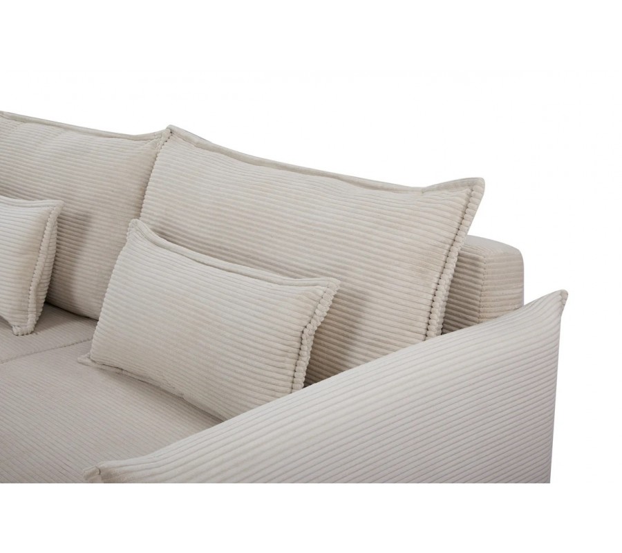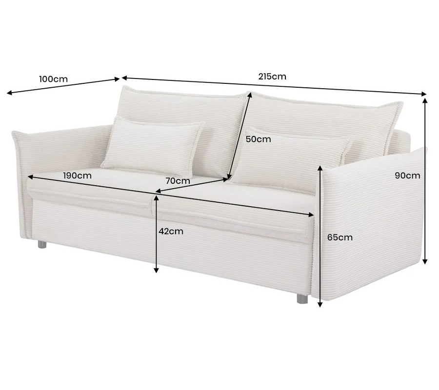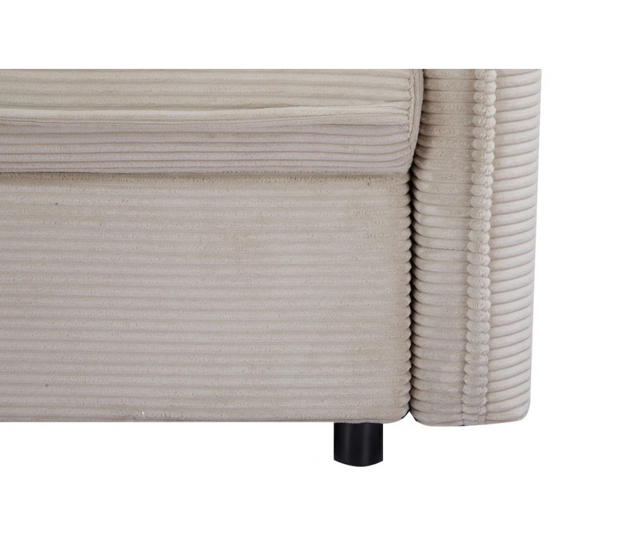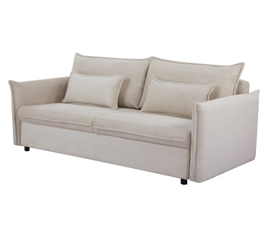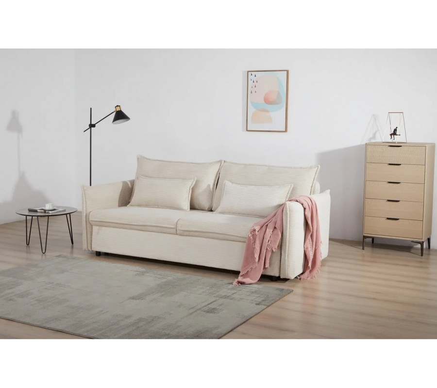 Sedačka obsahuje praktický úložný priestor pod sedadlom, ktorý môžete využiť na odkladanie diek či vankúšov. Je tiež možné ju roztiahnuť, čím vznikne lôžko s rozmermi 190x145 cm. Béžový poťah je vyrobený z mikrovlákna, ktoré zaručuje výbornú odolnosť voči vplyvom každodenného používania a zjednodušuje údržbu. Textília má povrchovú úpravu pripomínajúcu kord, kde sa striedajú hladko tkané pásy s pásmi s vyšším vlasom. Je príjemná na dotyk a zároveň vytvára elegantný dekoračný element.