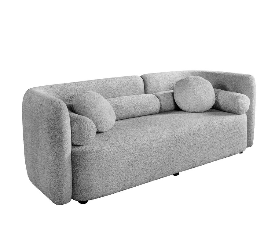 Štýlová art deco trojmiestna geometrická sivá bouclé sedačka Jina s dvomi okrúhlymi a dvomi valcovými vankúšmi 198 cm
