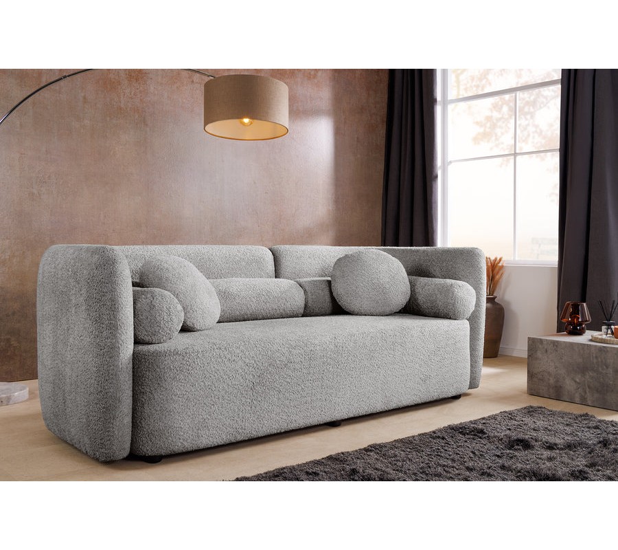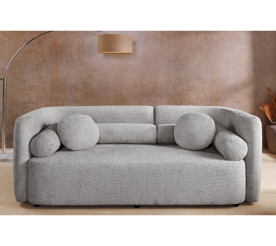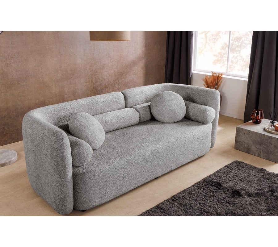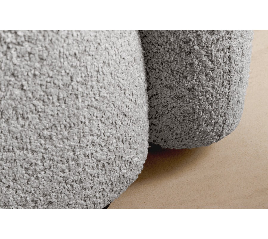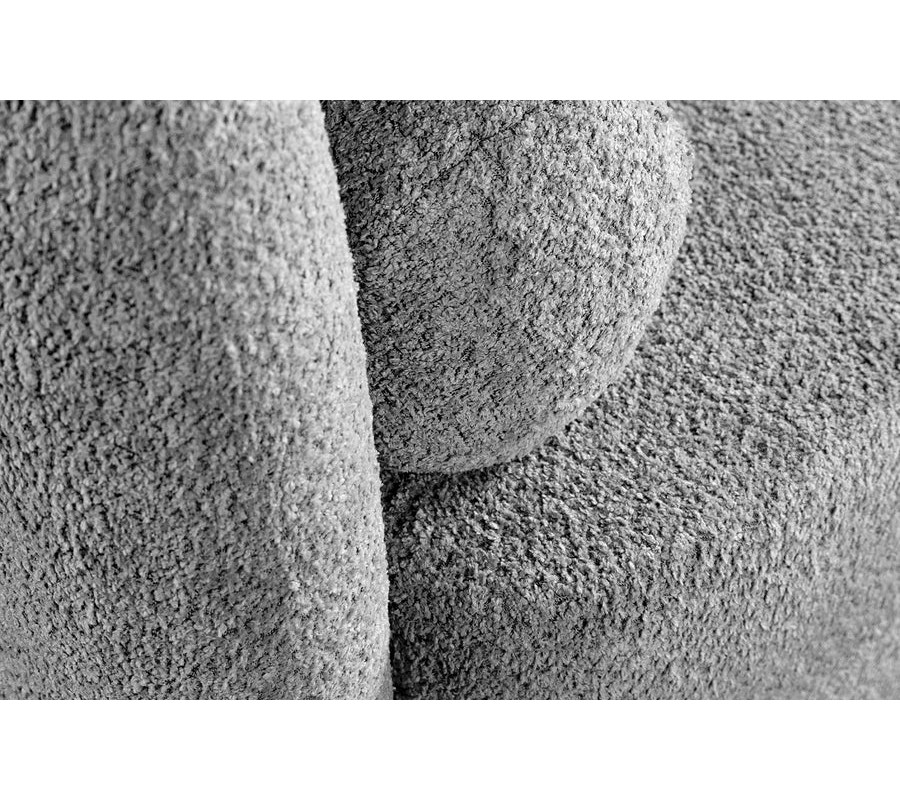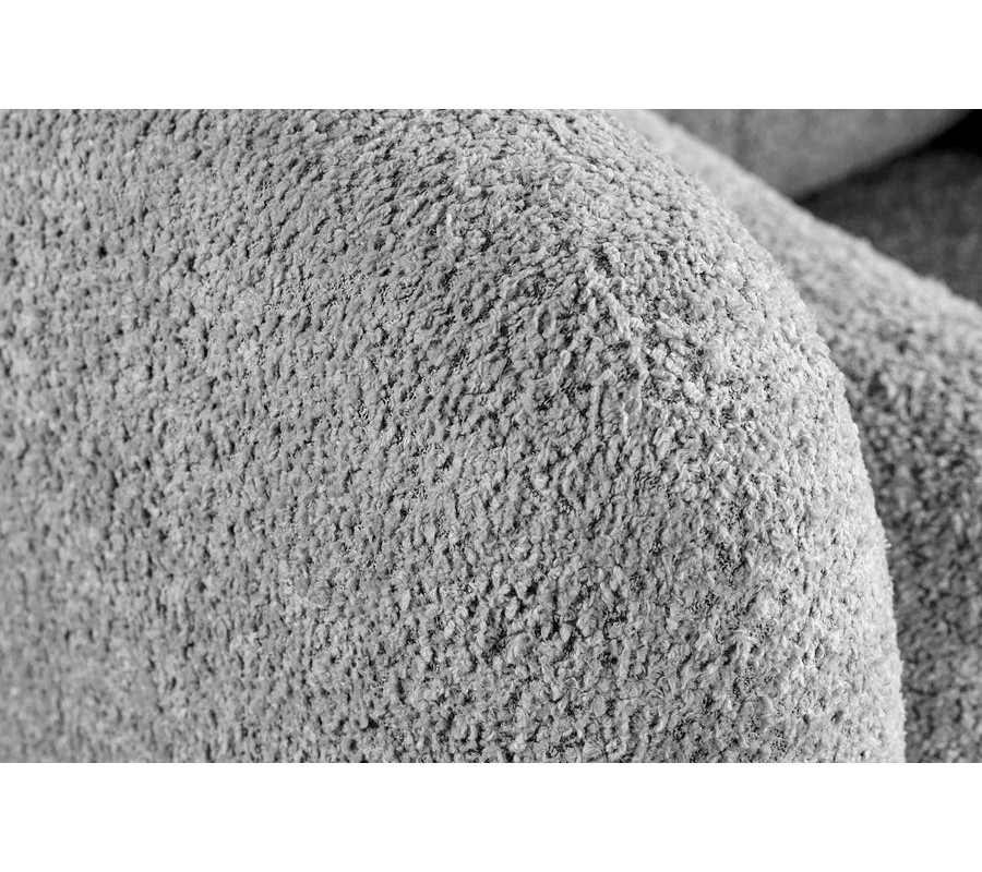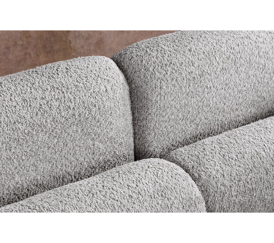 Štýlová art deco trojmiestna geometrická sivá bouclé sedačka Jina s dvomi okrúhlymi a dvomi dlhými valcovými vankúšmi zaujme netradičným tvarom a elegantnou textúrou. Poťah z jemnej bouclé látky v sivom odtieni dodáva povrchu mäkkosť, optickú hĺbku a príjemný, hrejivý vzhľad, ktorý krásne ladí s moderným aj retro interiérom.