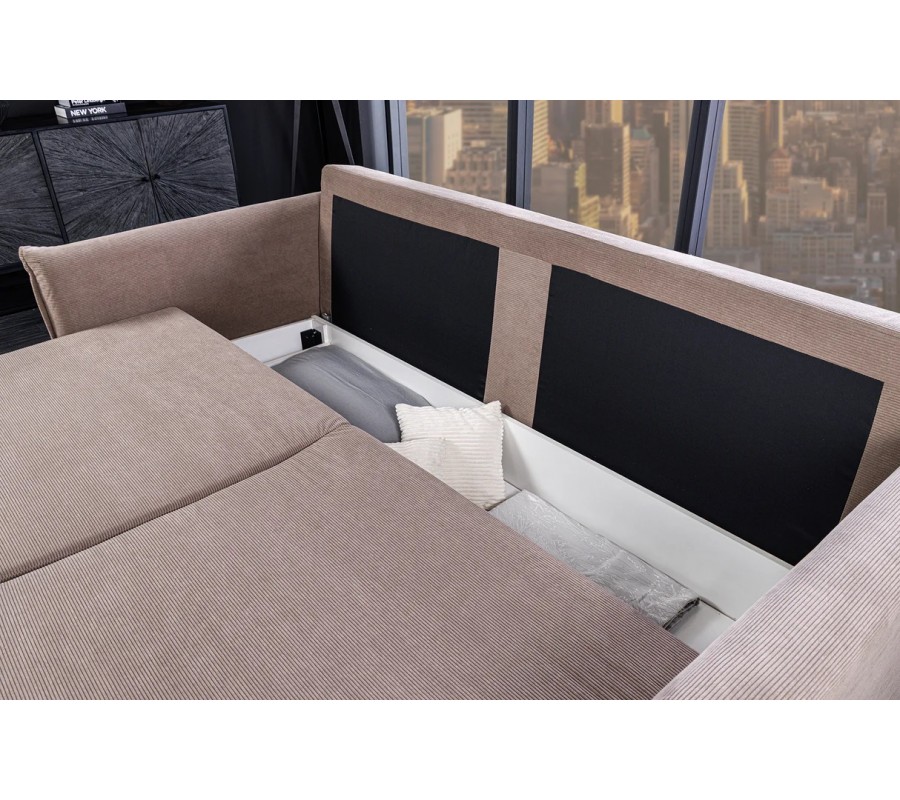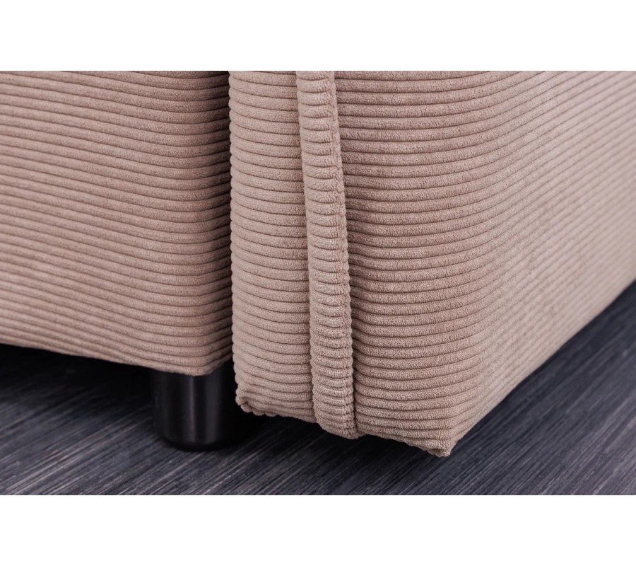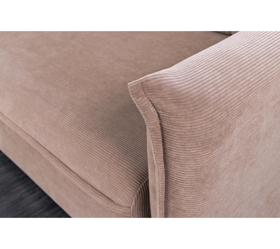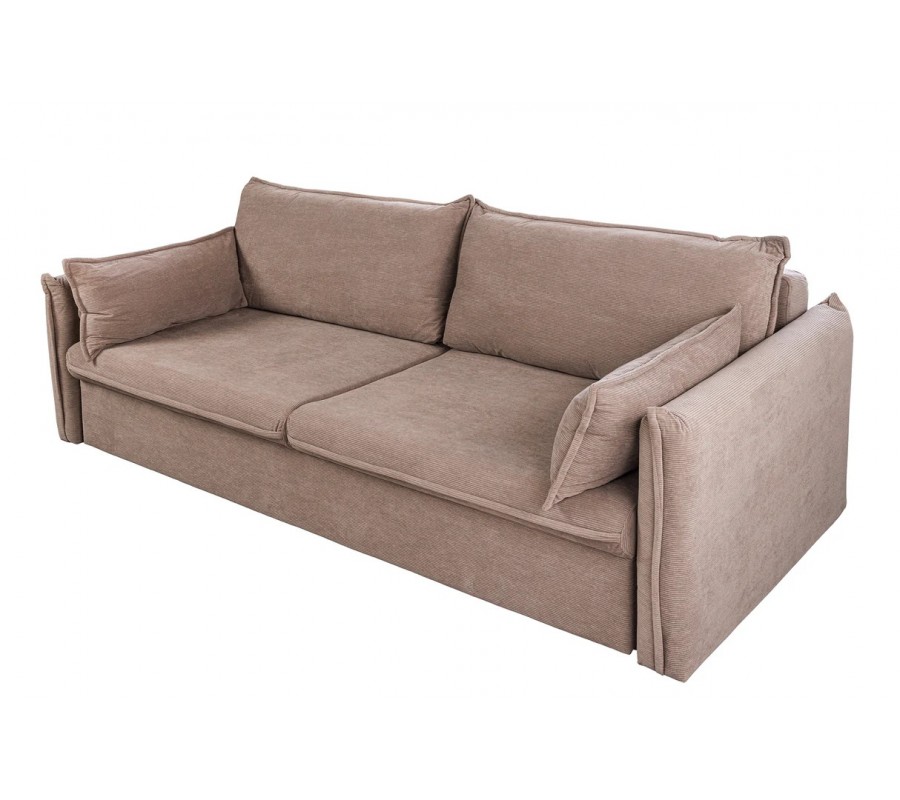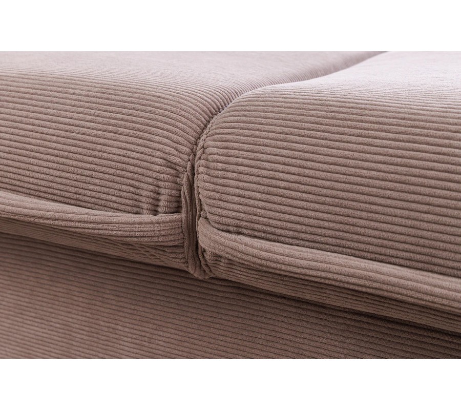 Bočné opierky sú síce pevné vďaka skrytej drevenej konštrukcii, no ich povrch pôsobí mäkko a nadýchane vďaka výraznému prešívaniu a dizajnu pripomínajúcemu vankúše. Tento detail dodáva sedačke estetickú hĺbku a zároveň komfortný vzhľad. Sedacia časť je rozdelená na dve rovnomerné čalúnené časti s príjemnou hĺbkou sedenia. Sedačka sa dá rozložiť na dvojmiestnu posteľ. Disponuje taktiež úložným priestorom.