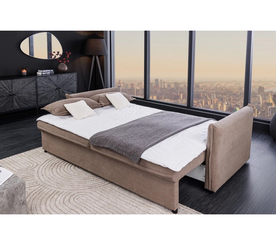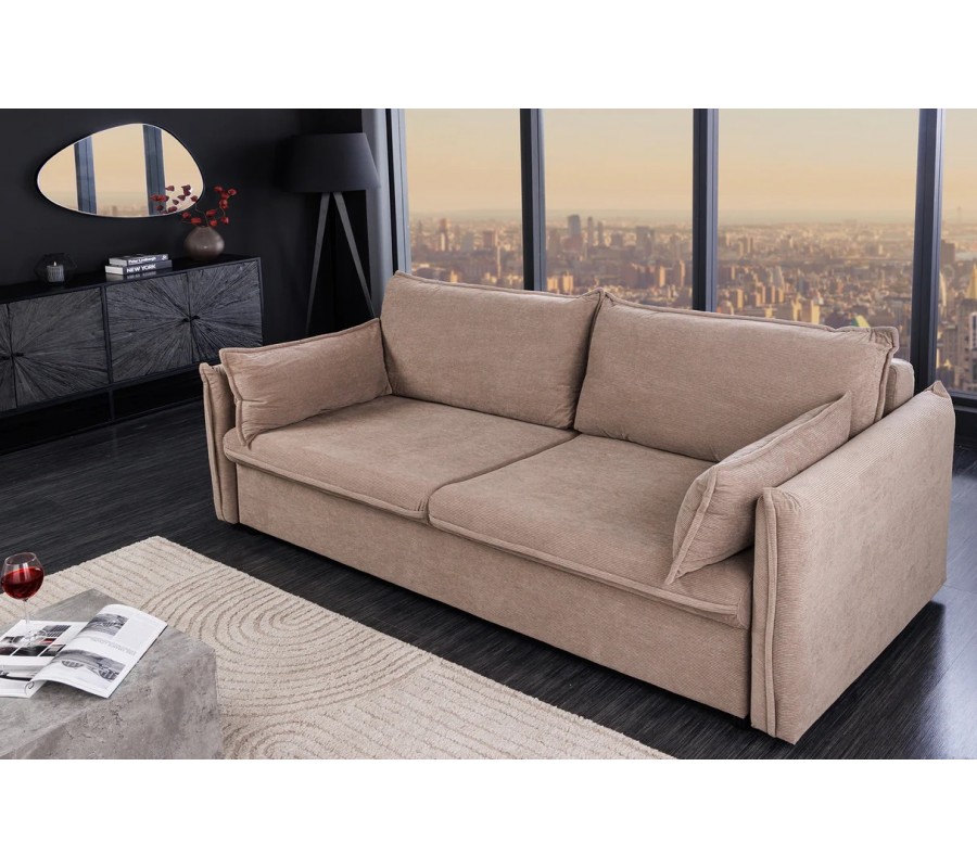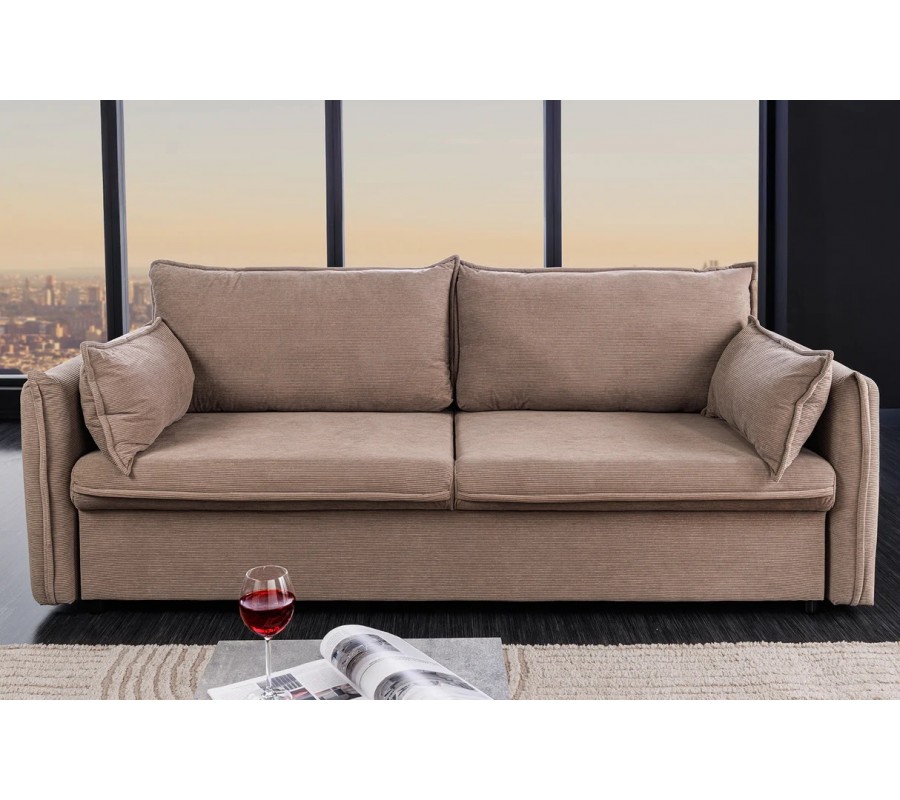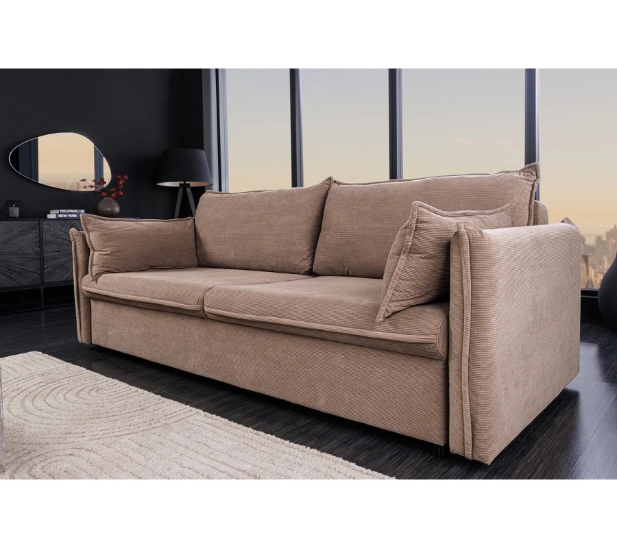 Moderná rozkladacia obdĺžniková trojmiestna sedačka Heaven v taupe sivej farbe s kordovým poťahom a dizajnovými vankúšmi 215 cm