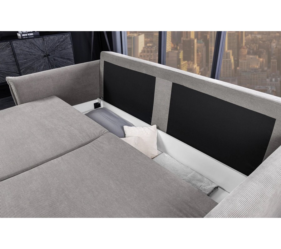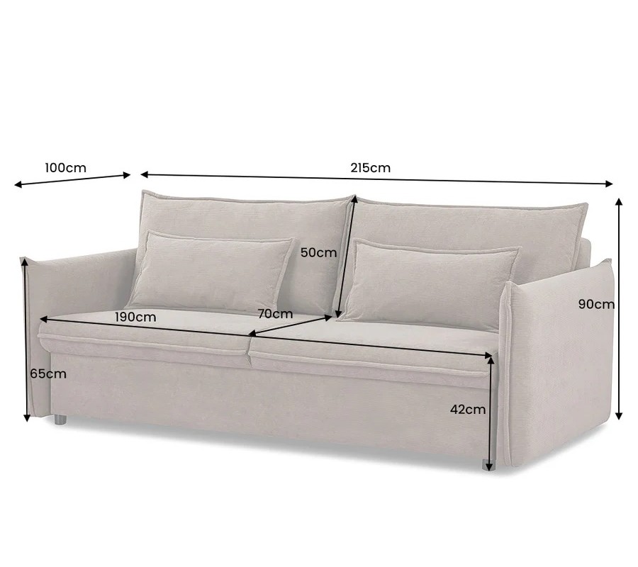 Chrbtová časť je vybavená dvoma veľkými operadlovými vankúšmi, zatiaľ čo po stranách sa nachádzajú vankúšové opierky s výrazným prešívaním. Hoci pôsobia mäkko, vnútorná drevená konštrukcia zabezpečuje ich stabilitu a pevnosť. Sedacia časť je tvorená dvoma priestrannými vankúšmi, ktoré poskytujú výnimočný komfort pri sedení aj ležaní. Sedačka je rozkladacia. Dokáže sa rozložiť na dvojmiestnu posteľ, ktorá ukrýva úložný priestor.